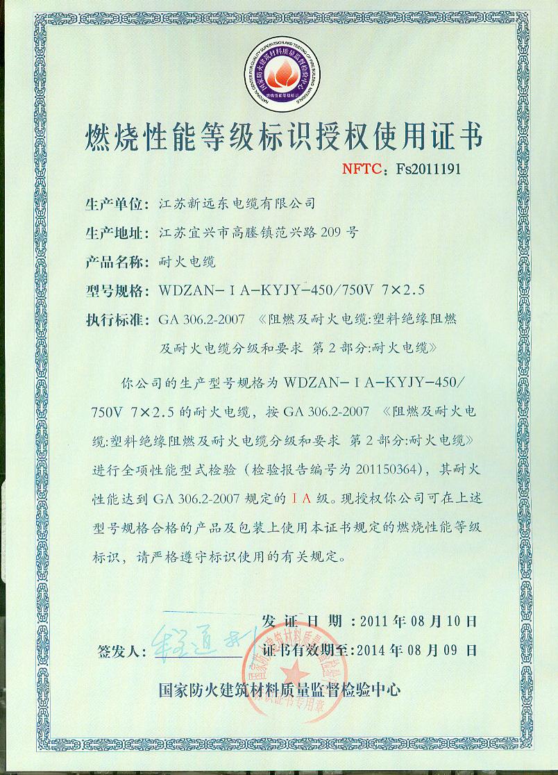 经检验,该WDZAN-ⅠA-KYJY-450/750V 7×2.5耐火电缆耐火性能符合ⅠA级规定要求,其它各项技术指标均合格。按GA 306.2-2007综合判定,该产品质量合格。(以下空白)