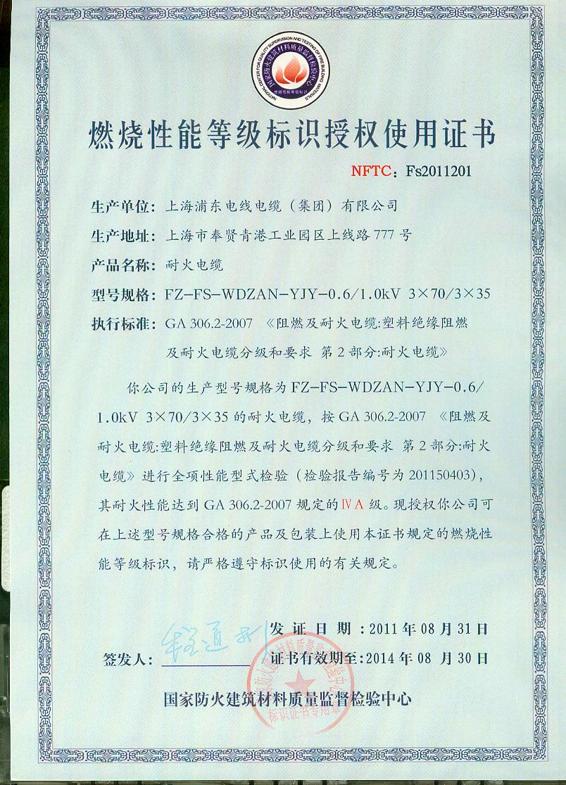 经检验,该FZ-FS-WDZAN-YJY-0.6/1.0kV 3×70/3×35耐火电缆耐火性能符合ⅣA级规定要求,其它各项技术指标均合格。按GA 306.2-2007综合判定,该产品质量合格。(以下空白)