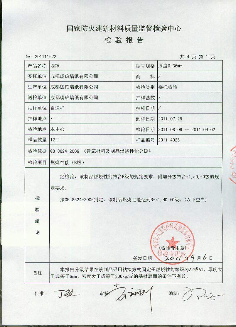 经检验,该制品燃烧性能符合B级的规定要求,附加分级符合s1,d0,t0级的规定要求。按GB 8624-2006判定,该制品燃烧性能达到B-s1,d0,t0级。(以下空白)