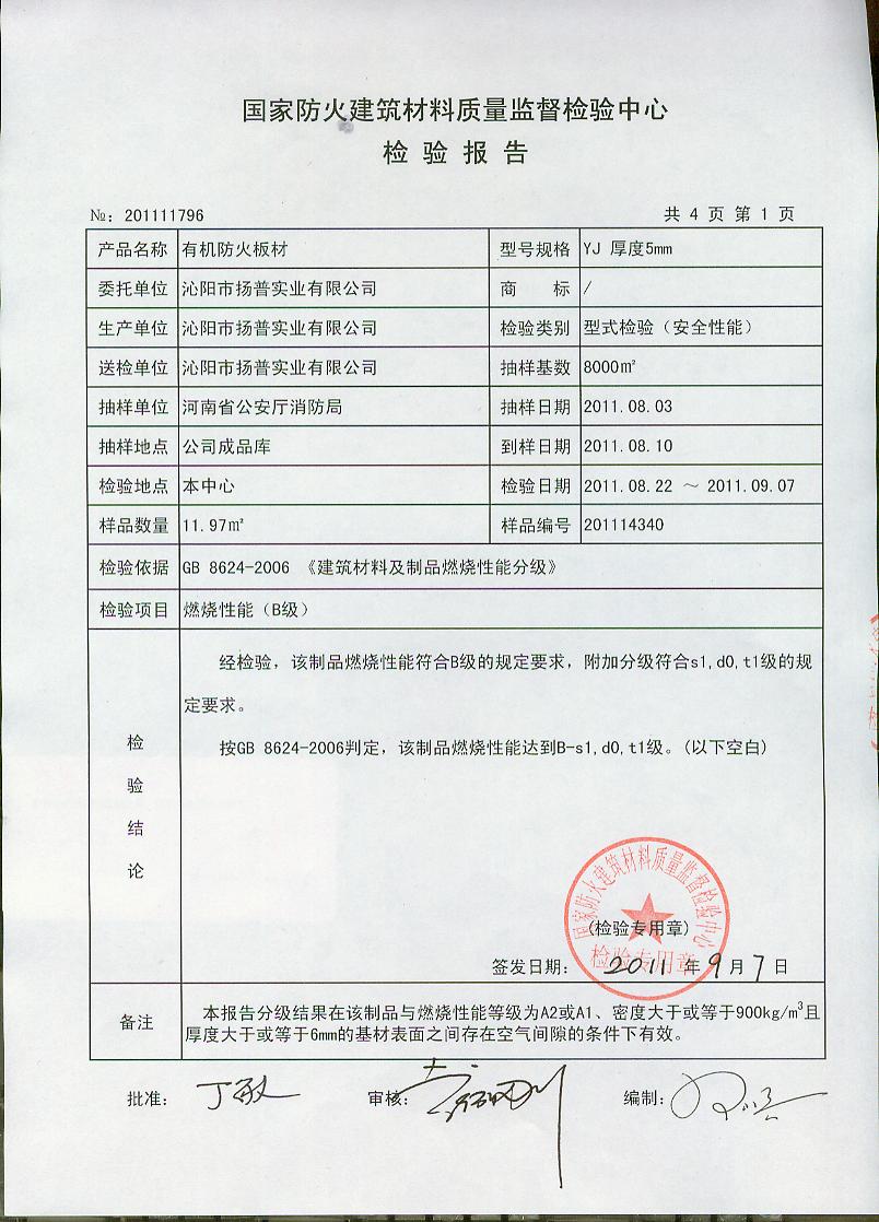 经检验,该制品燃烧性能符合B级的规定要求,附加分级符合s1,d0,t1级的规定要求。按GB 8624-2006判定,该制品燃烧性能达到B-s1,d0,t1级。(以下空白)