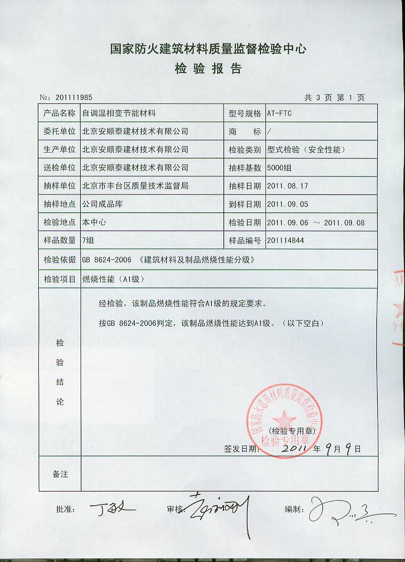 经检验,该制品燃烧性能符合A1级的规定要求。 按GB 8624-2006判定,该制品燃烧性能达到A1级。(以下空白)