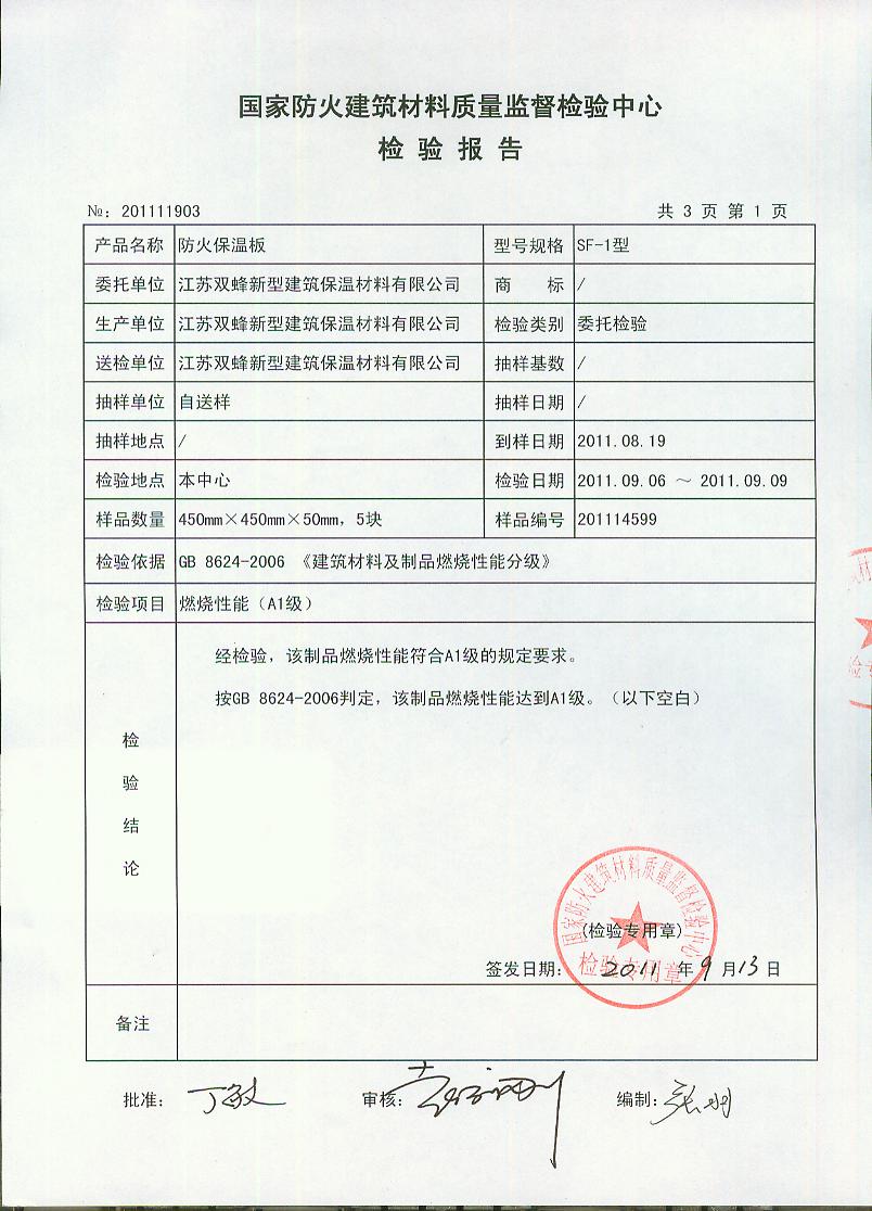 经检验,该制品燃烧性能符合A1级的规定要求。按GB 8624-2006判定,该制品燃烧性能达到A1级。(以下空白)