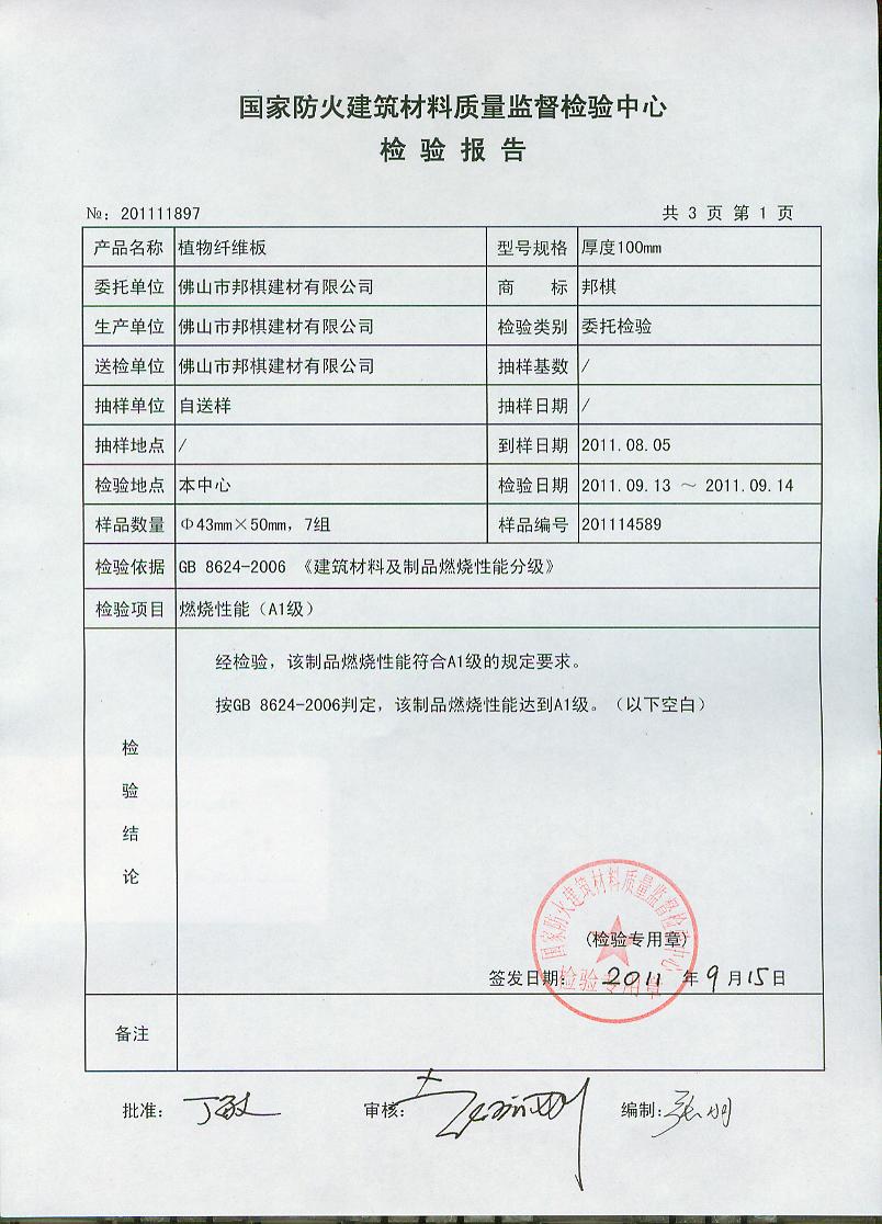 经检验,该制品燃烧性能符合A1级的规定要求。按GB 8624-2006判定,该制品燃烧性能达到A1级。(以下空白)