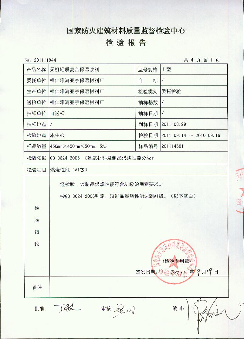 经检验,该制品燃烧性能符合A1级的规定要求。按GB 8624-2006判定,该制品燃烧性能达到A1级。(以下空白)