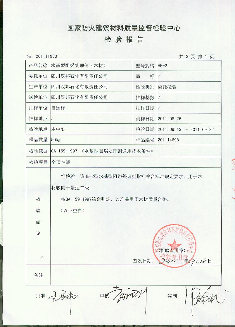 经检验,该HE-2型水基型阻燃处理剂指标符合标准规定要求。用于木材吸附干量达二级; 按GA 159-1997综合判定,该产品用于木材质量合格。 (以下空白)