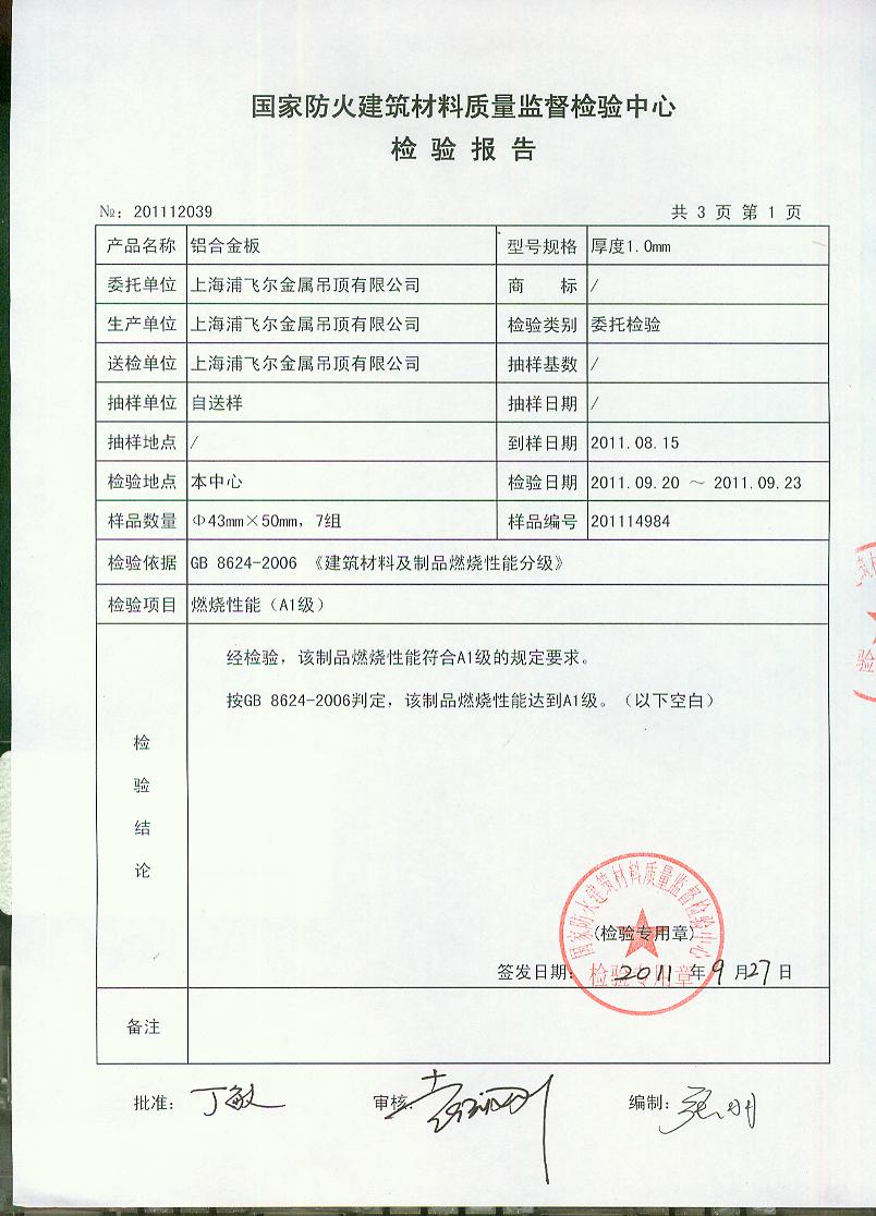 经检验,该制品燃烧性能符合A1级的规定要求。按GB 8624-2006判定,该制品燃烧性能达到A1级。(以下空白)