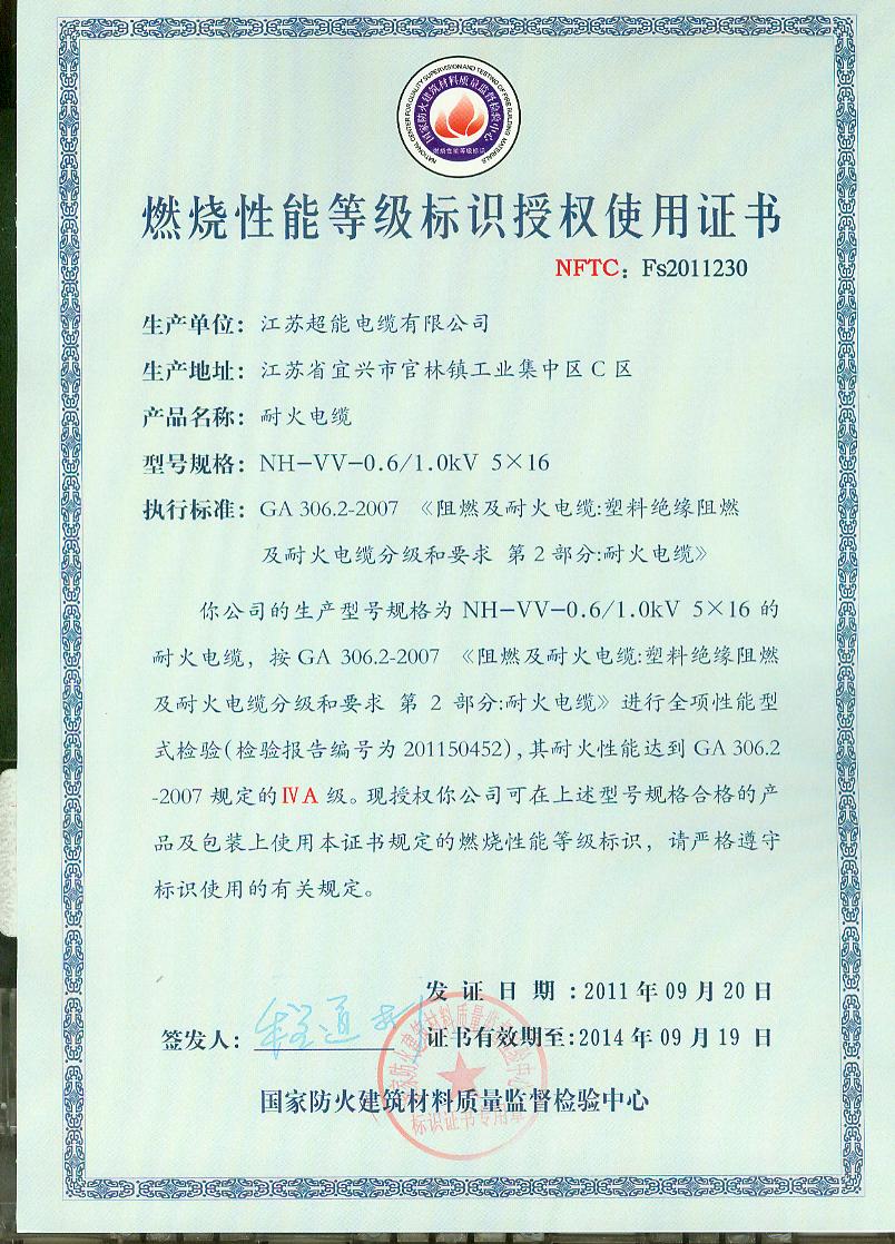 经检验,该NH-VV-0.6/1.0kV 5×16耐火电缆耐火性能符合ⅣA级规定要求,其它各项技术指标均合格。 按GA 306.2-2007综合判定,该产品质量合格。(以下空白)