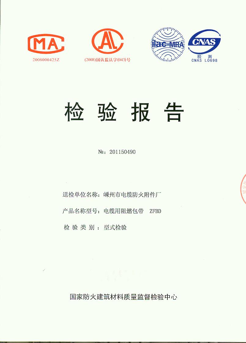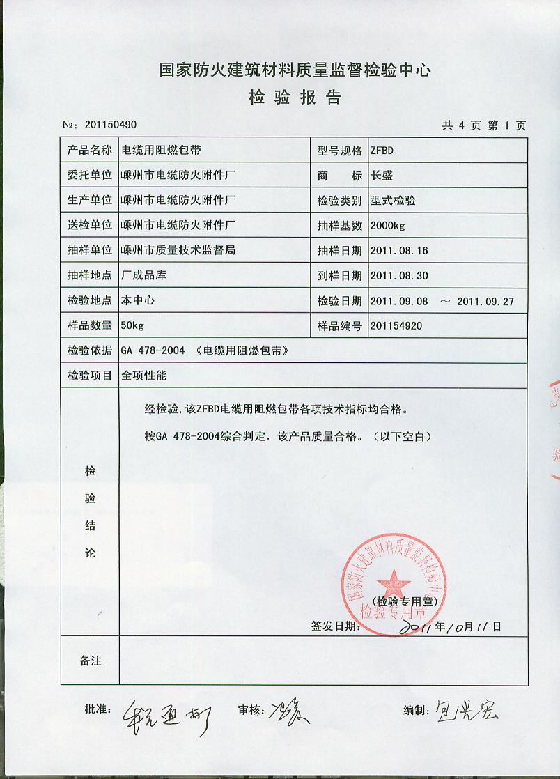 经检验,该ZFBD电缆用阻燃包带各项技术指标均合格。按GA 478-2004综合判定,该产品质量合格。(以下空白)