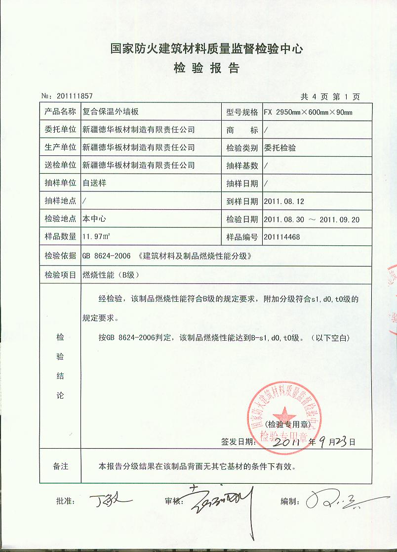 经检验,该制品燃烧性能符合B级的规定要求,附加分级符合s1,d0,t0级的规定要求。 按GB 8624-2006判定,该制品燃烧性能达到B-s1,d0,t0级。(以下空白)