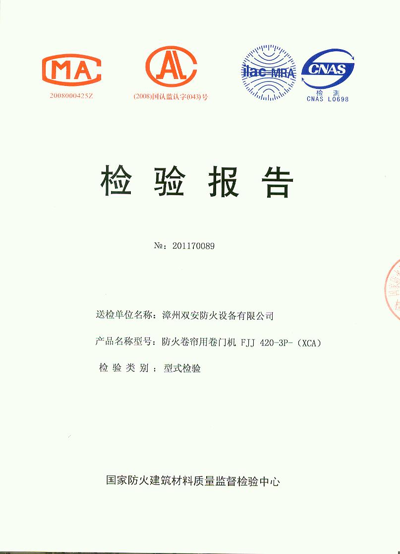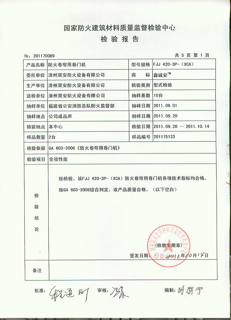 经检验,该FJJ420-3P-(XCA)防火卷帘用卷门机各项技术指标均合格。按GA 603-2006综合判定,该产品质量合格。(以下空白)