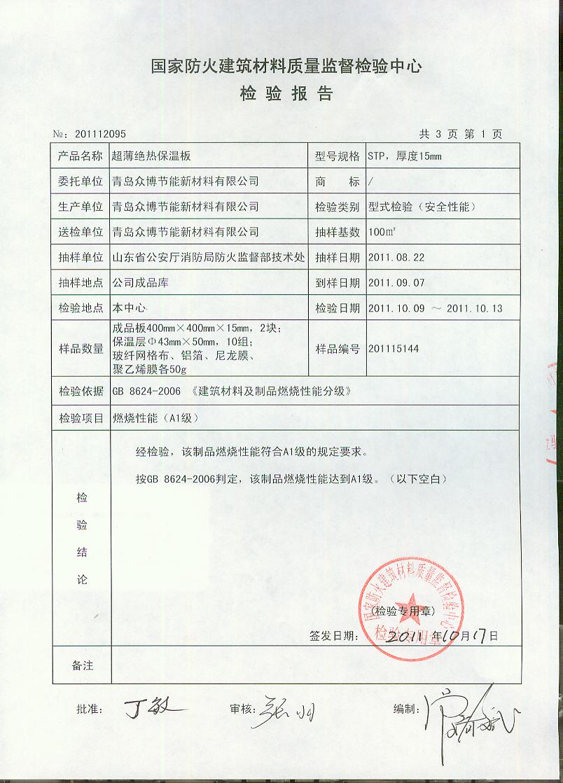 经检验,该制品燃烧性能符合A1级的规定要求。按GB 8624-2006判定,该制品燃烧性能达到A1级。(以下空白)