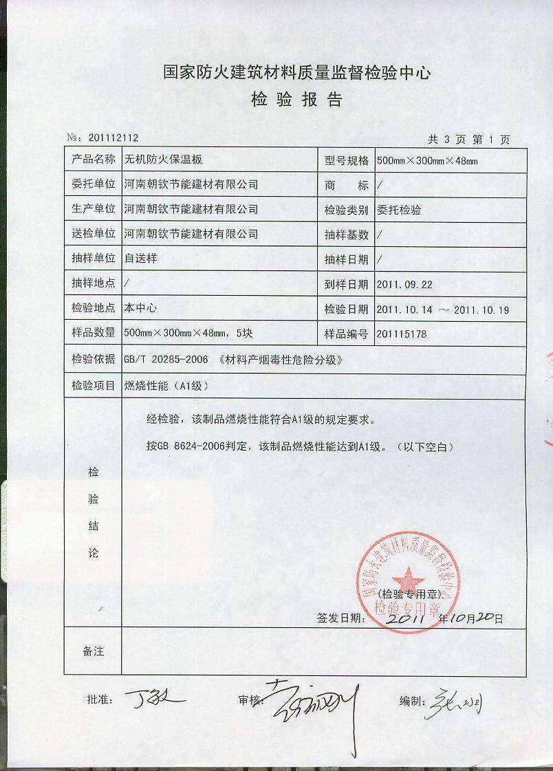 经检验,该制品燃烧性能符合A1级的规定要求。按GB 8624-2006判定,该制品燃烧性能达到A1级。(以下空白)