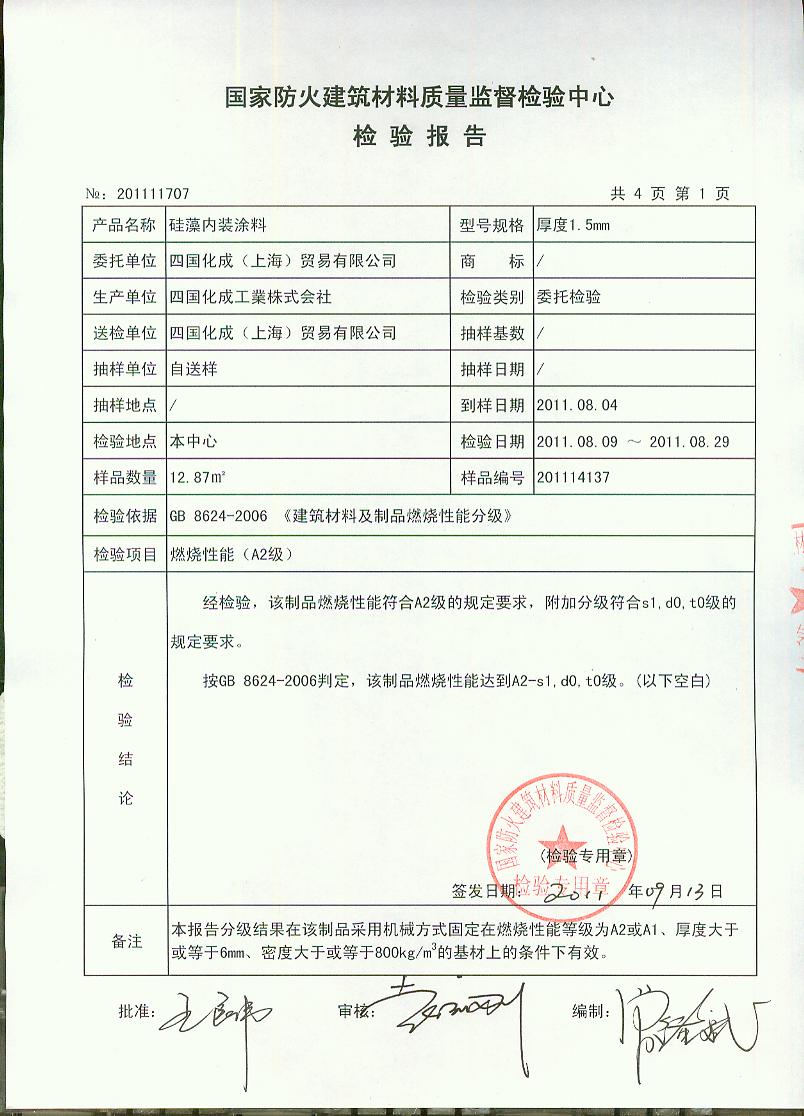 经检验,该制品燃烧性能符合A2级的规定要求,附加分级符合s1,d0,t0级的 规定要求。 按GB 8624-2006判定,该制品燃烧性能达到A2-s1,d0,t0级。(以下空白)