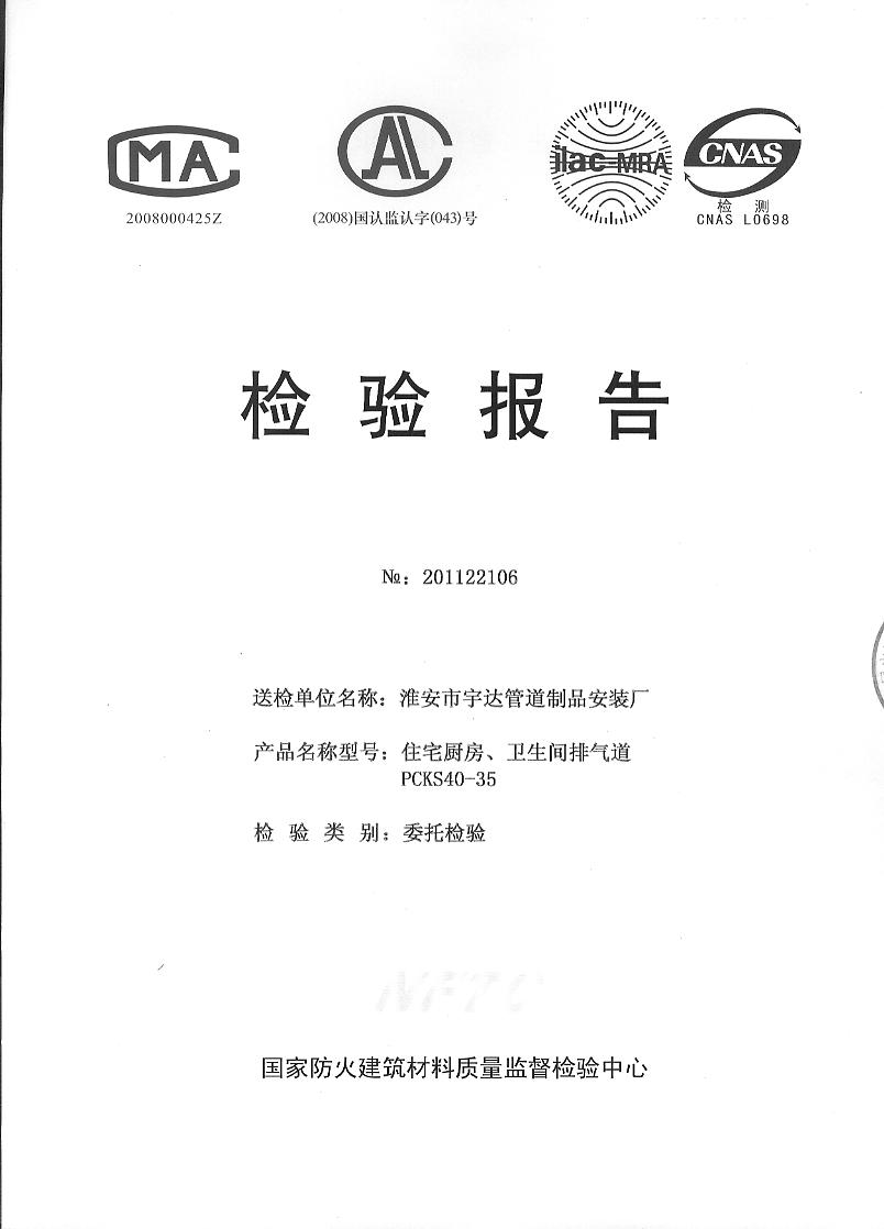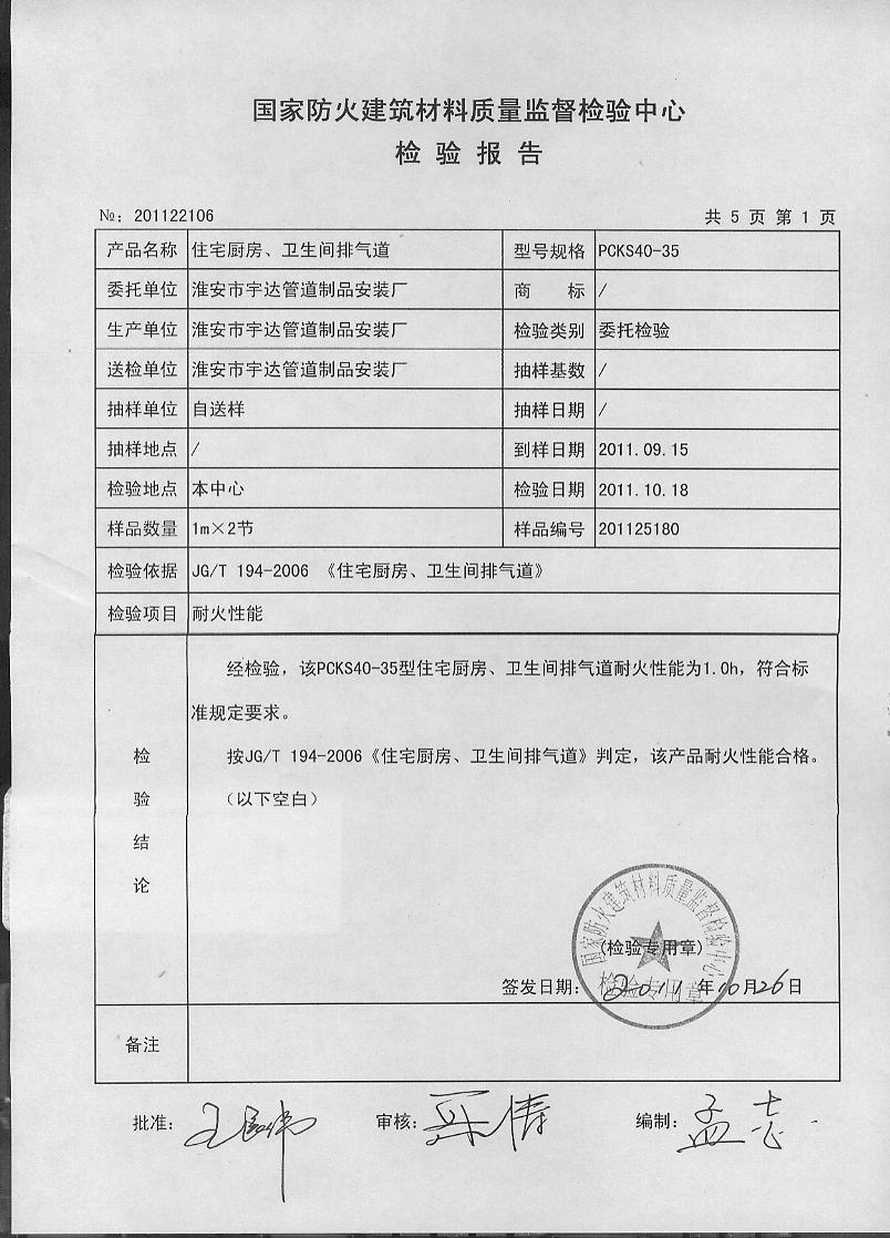 经检验,该PCKS 40-35型住宅厨房、卫生间排气道耐火性能为1.0h,符合标准规定要求。 按JG/T 194-2006《住宅厨房、卫生间排气道》判定,该产品耐火性能合格。 (以下空白)