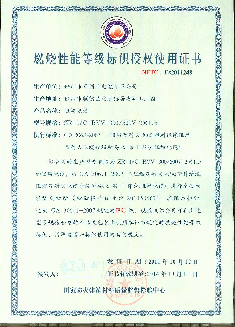经检验,该ZR-ⅣC-RVV-300/500V 2×1.5阻燃电缆阻燃性能符合ⅣC级规定要 求,其它各项技术指标均合格。 按GA 306.1-2007综合判定,该产品质量合格。 (以下空白