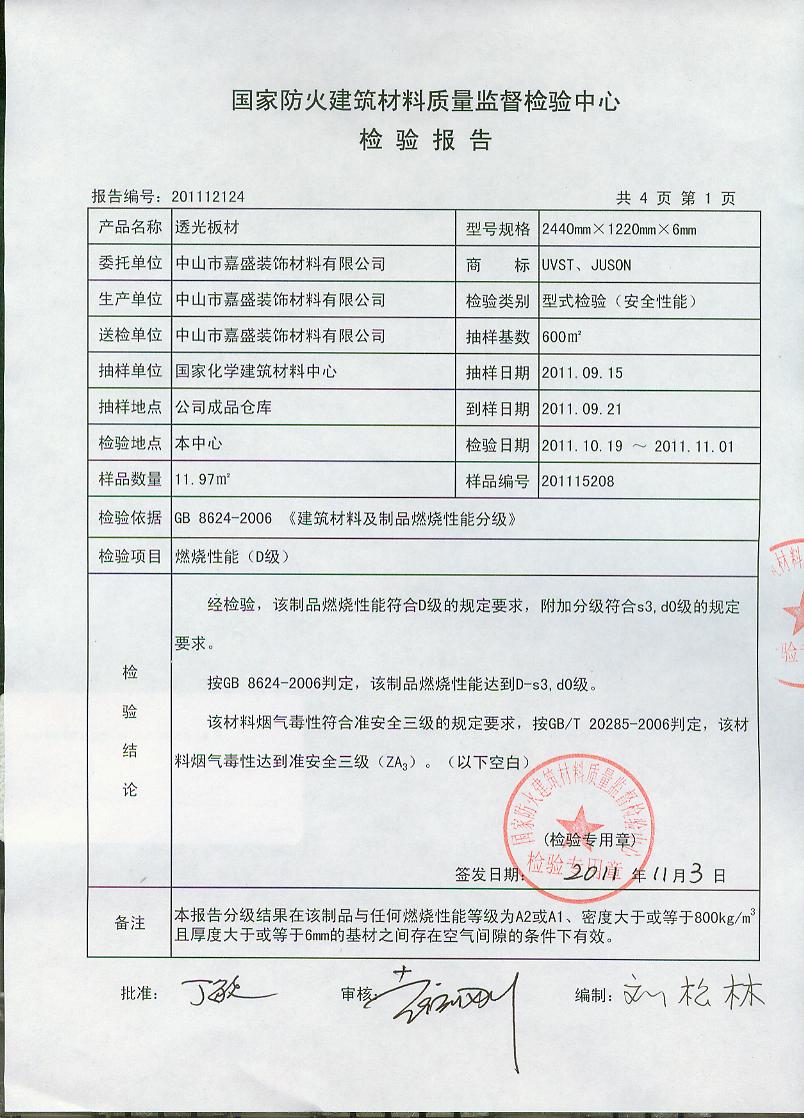 经检验,该材料燃烧性能符合D级的规定要求,按GB 8624-2006判定,该材燃烧性能达到D-s,d级。