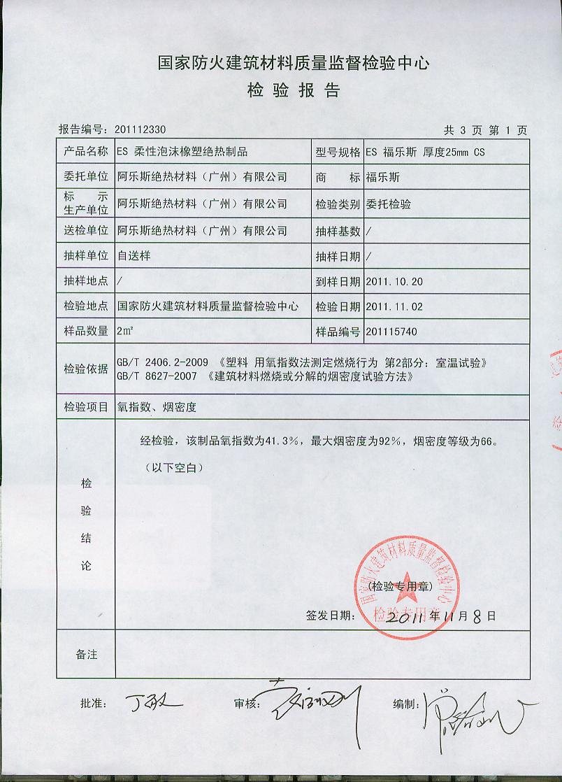 经检验,该制品氧指数为41.3%,最大烟密度为92%,烟密度等级为66。 (以下空白)