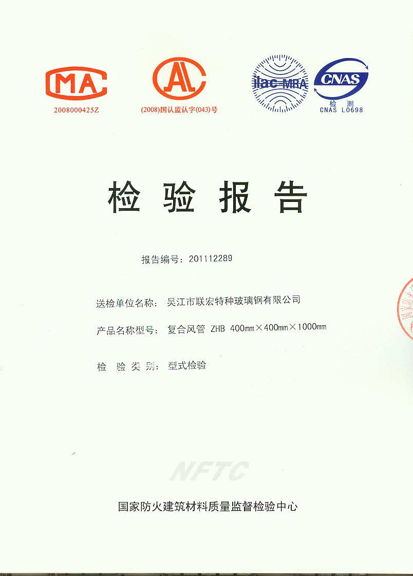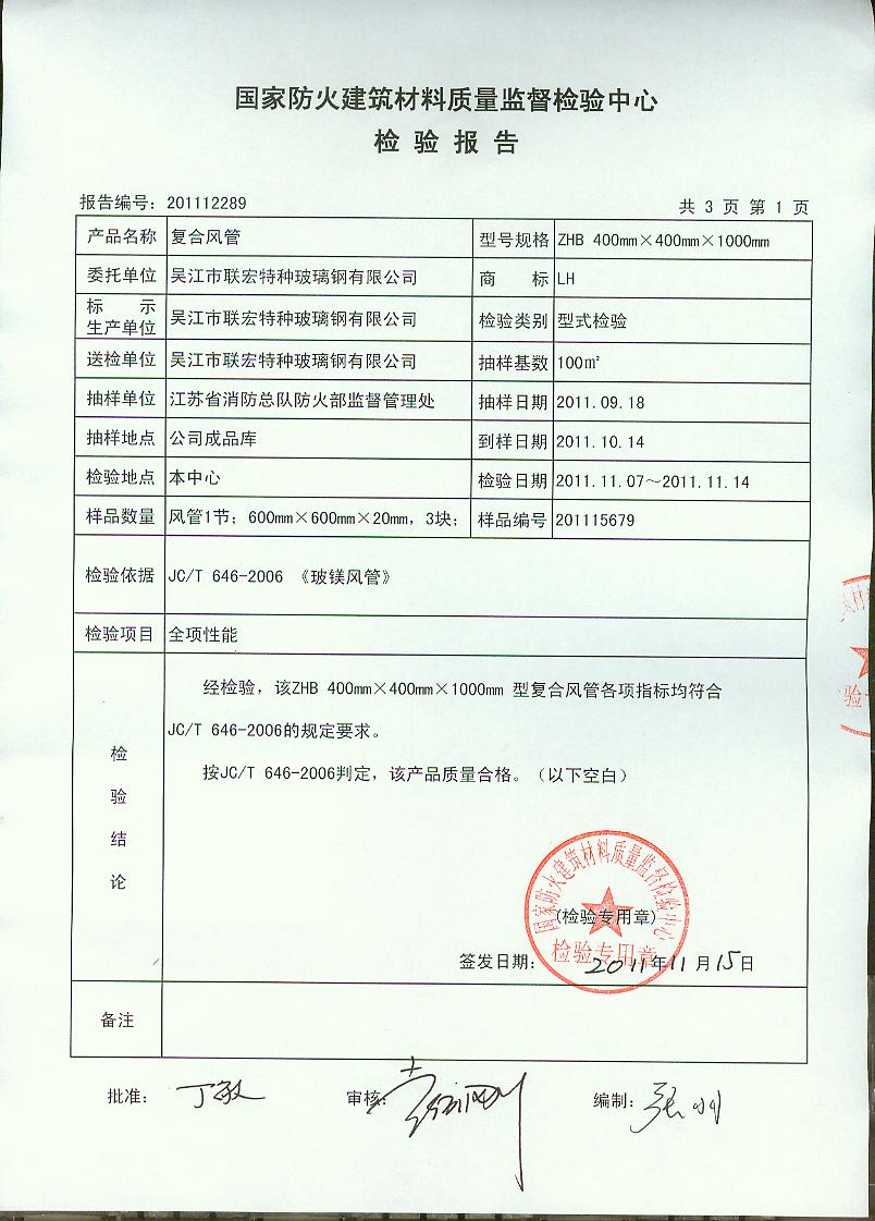 经检验,该ZHB 400mm×400mm×1000mm 型复合风管各项指标均符合JC/T 646-2006的规定要求。 按JC/T 646-2006判定,该产品质量合格。(以下空白)