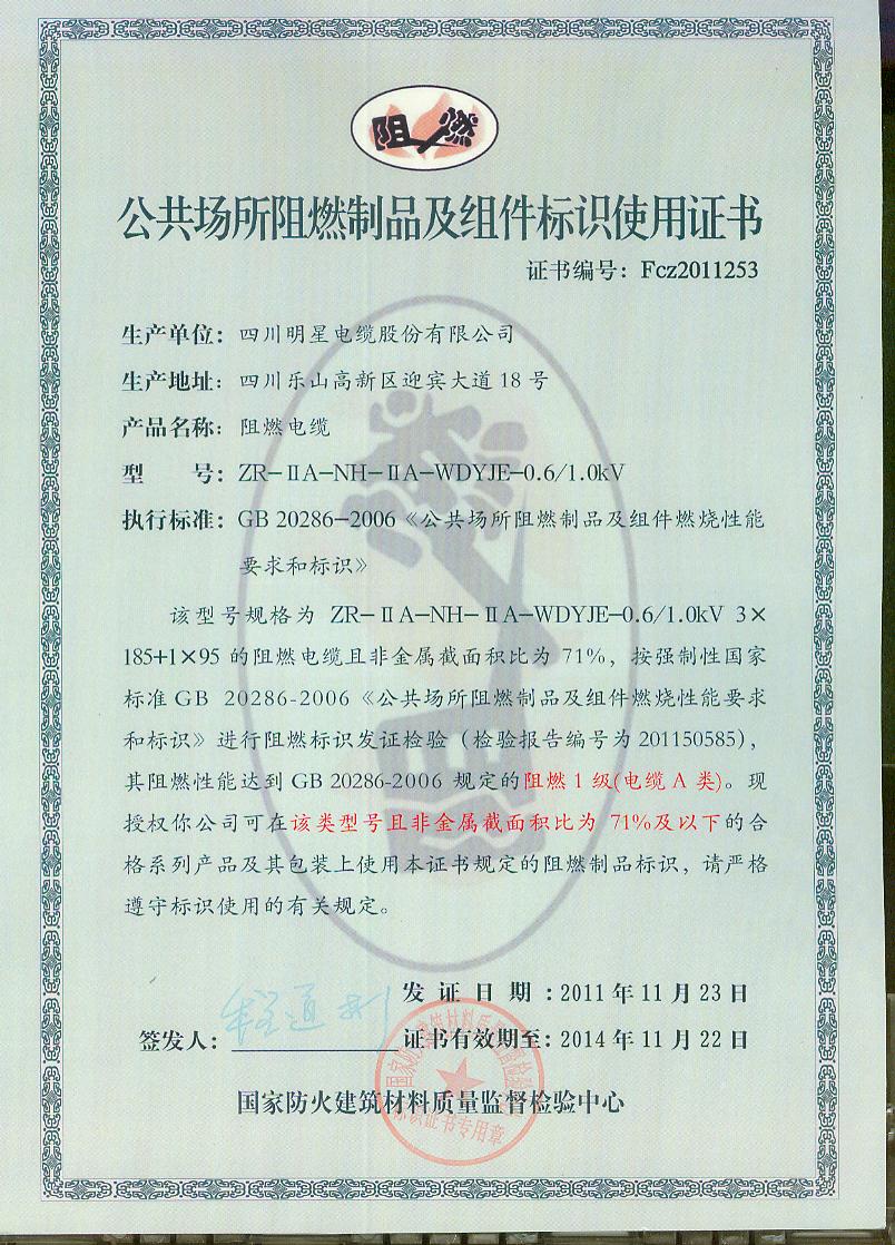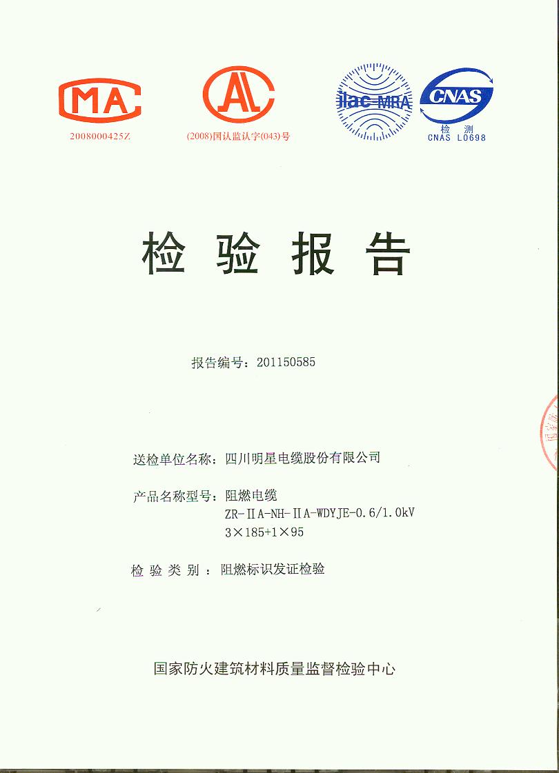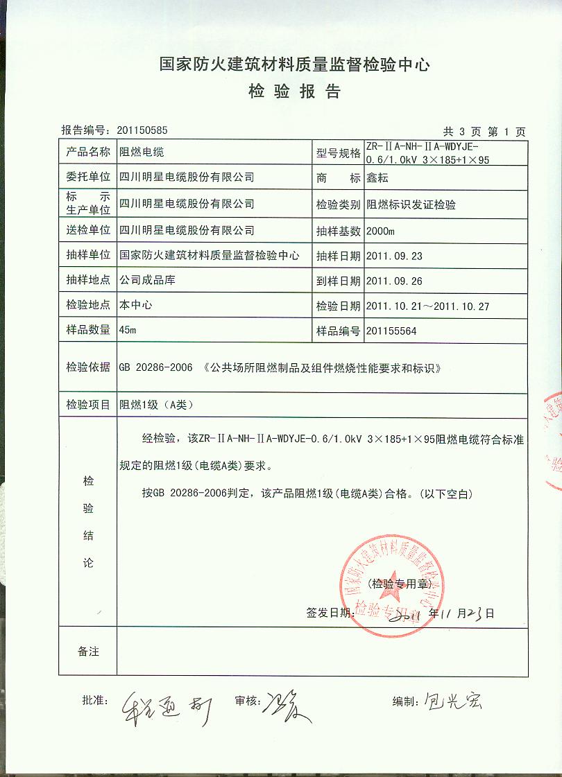 经检验,该ZR-ⅡA-NH-ⅡA-WDYJE-0.6/1.0kV 3×185+1×95阻燃电缆符合标准规定的阻燃1级(电缆A类)要求。 按GB 20286-2006判定,该产品阻燃1级(电缆A类)合格。(以下空白)