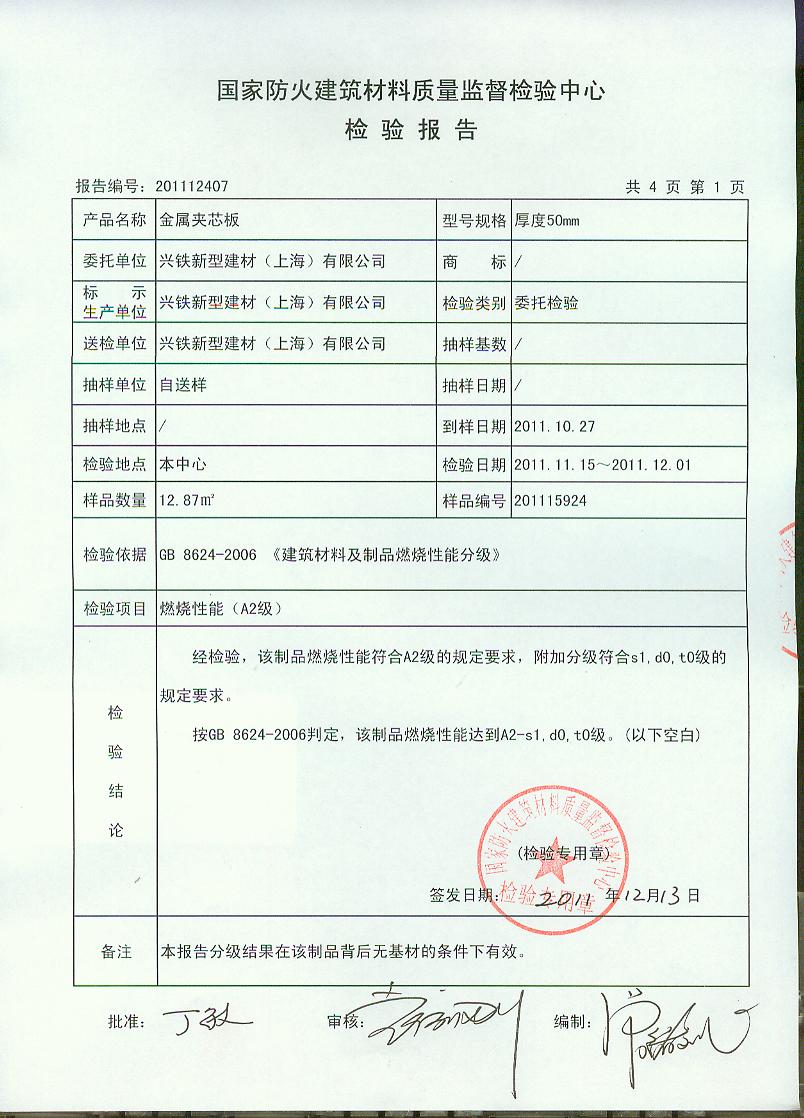 经检验,该制品燃烧性能符合A2级的规定要求,附加分级符合s1,d0,t0级的 规定要求。 按GB 8624-2006判定,该制品燃烧性能达到A2-s1,d0,t0级。(以下空白)