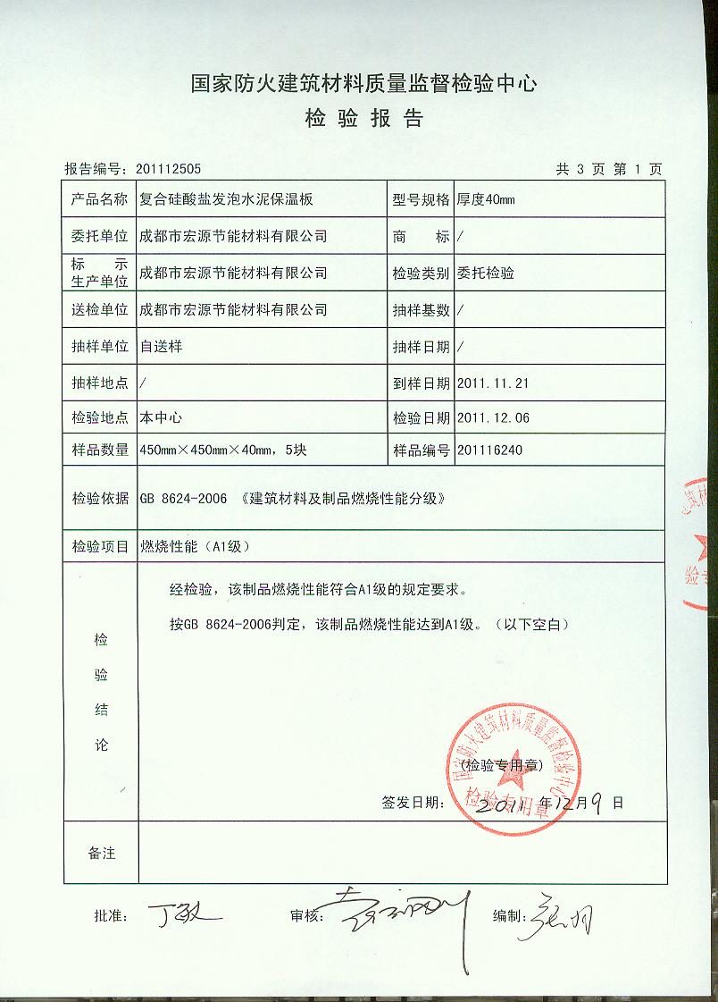 经检验,该制品燃烧性能符合A1级的规定要求。 按GB 8624-2006判定,该制品燃烧性能达到A1级。(以下空白)