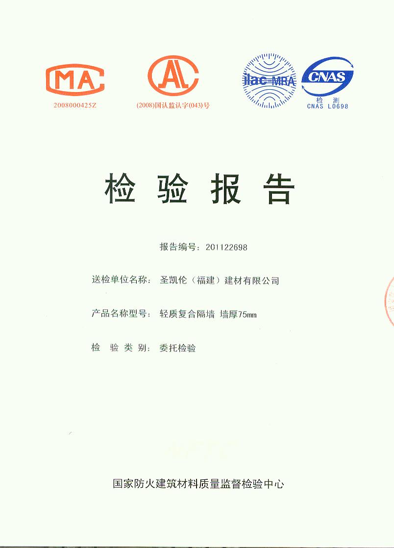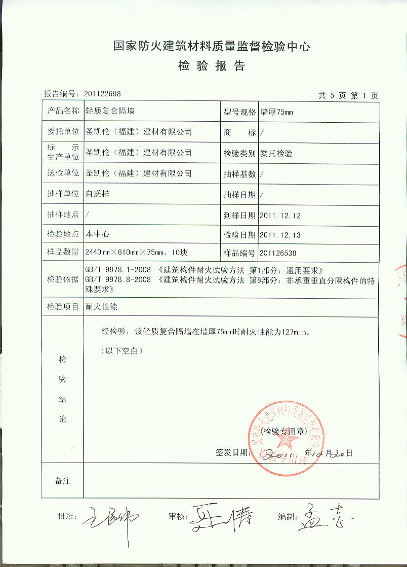 经检验,该轻质复合隔墙在墙厚75mm时耐火性能为127min。 (以下空白)