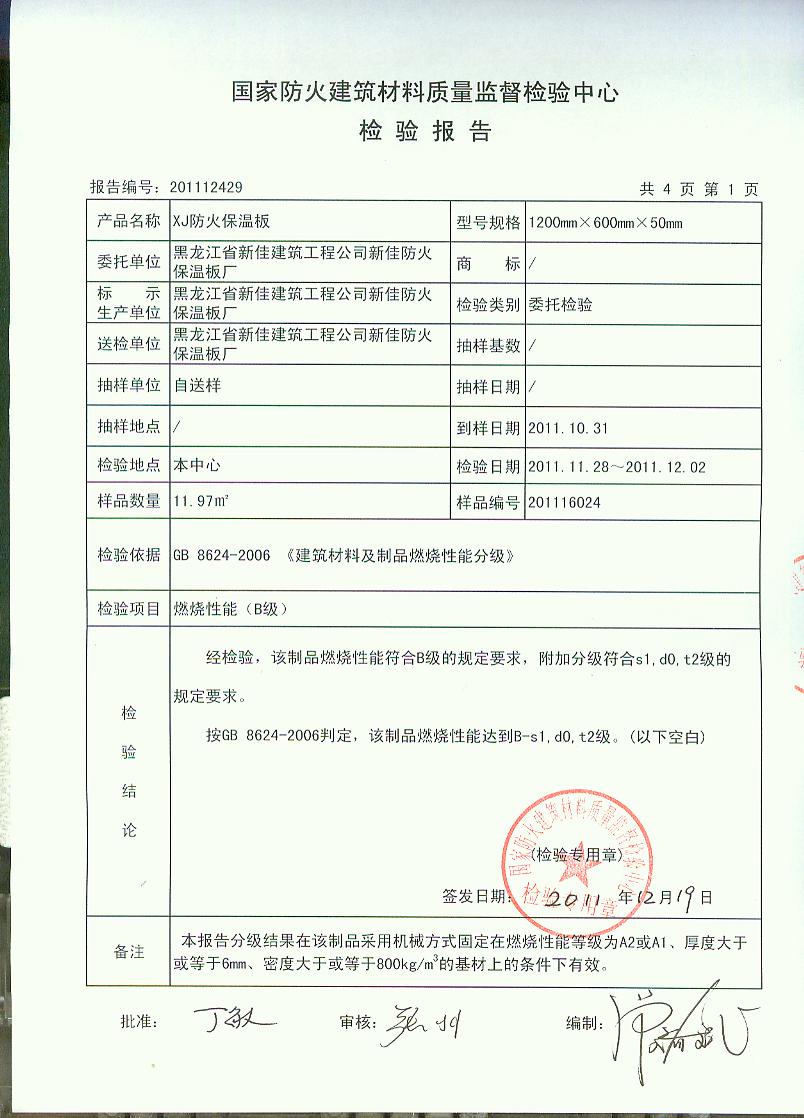 经检验,该制品燃烧性能符合B级的规定要求,附加分级符合s1,d0,t2级的 规定要求。 按GB 8624-2006判定,该制品燃烧性能达到B-s1,d0,t2级。(以下空白)