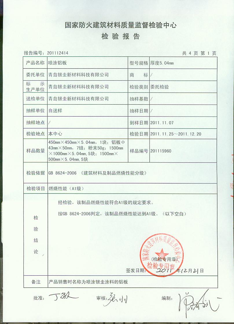 经检验,该制品燃烧性能符合A1级的规定要求。 按GB 8624-2006判定,该制品燃烧性能达到A1级。(以下空白)