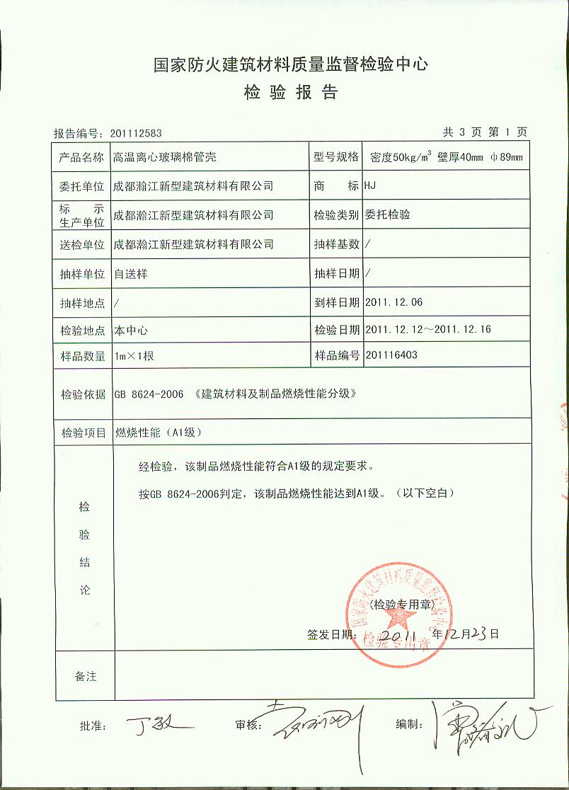 经检验,该制品燃烧性能符合A1级的规定要求。 按GB 8624-2006判定,该制品燃烧性能达到A1级。(以下空白)