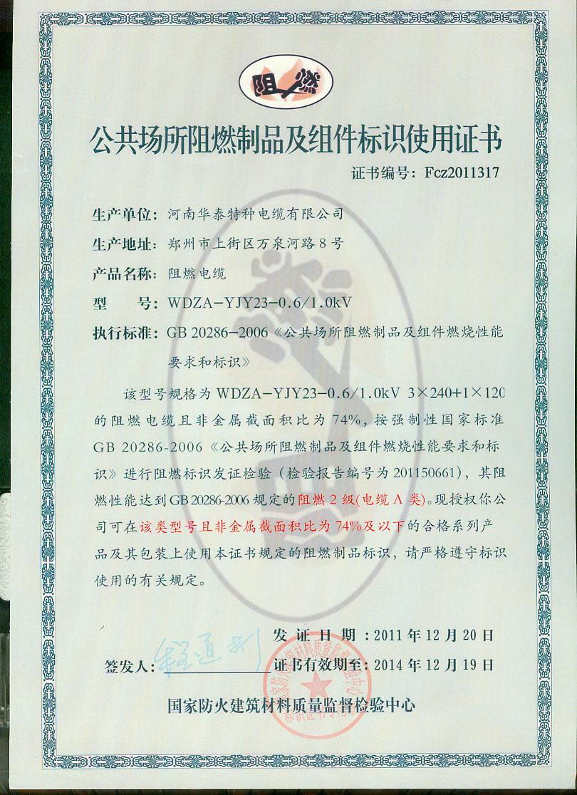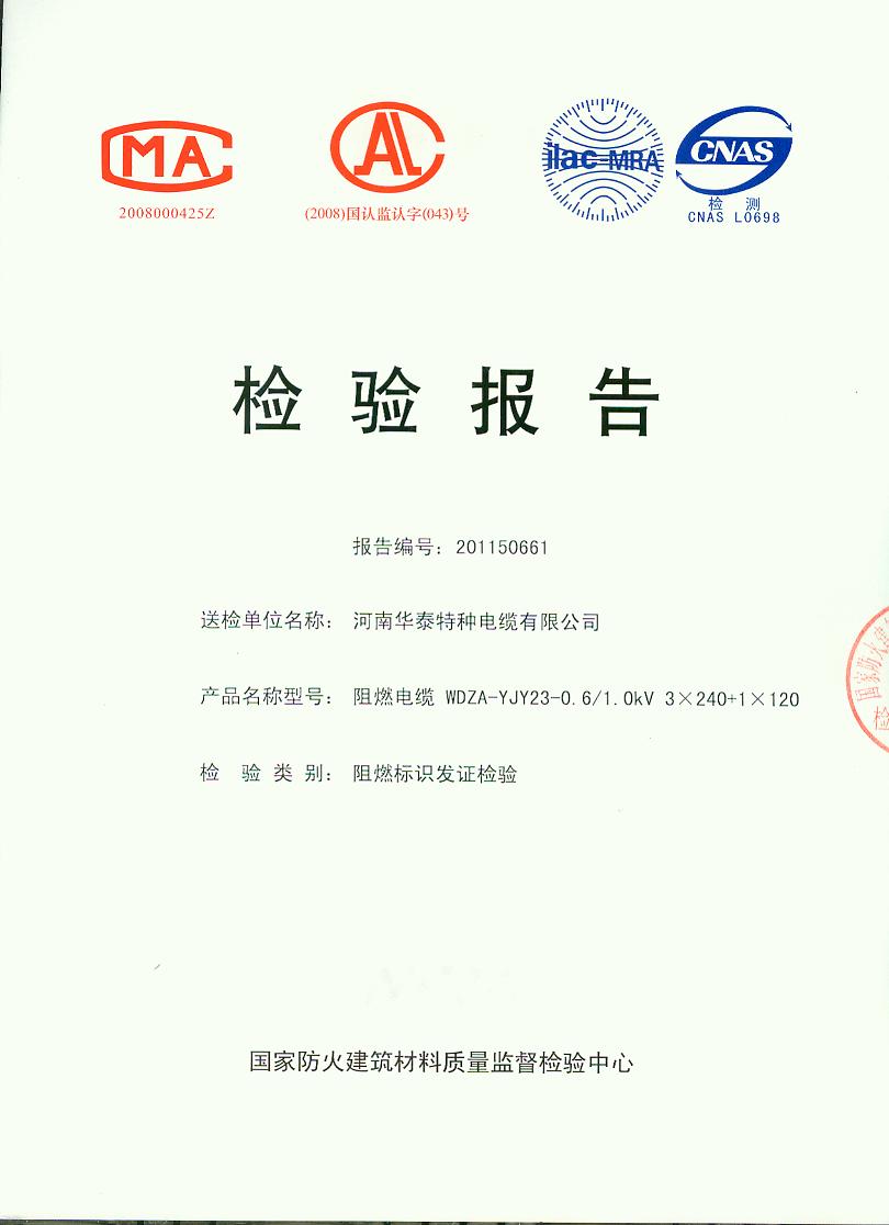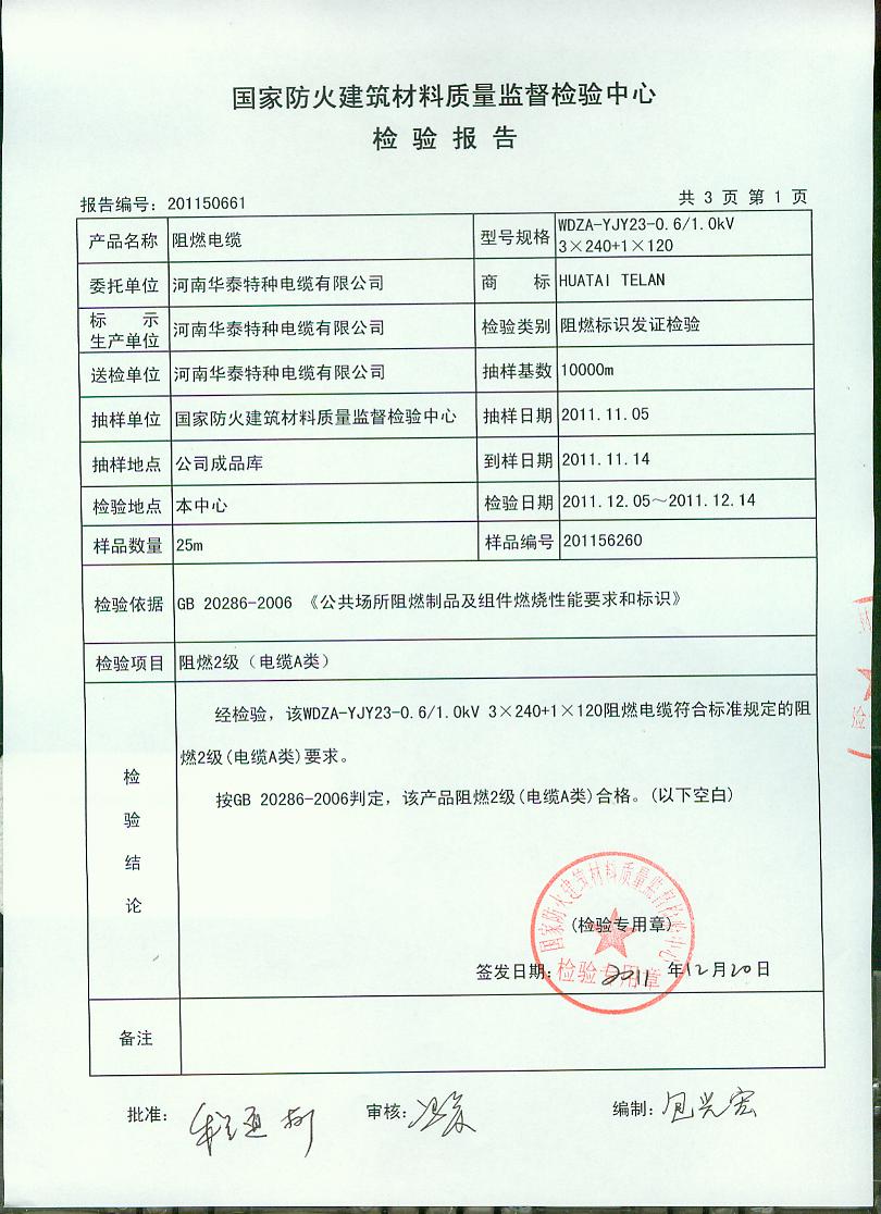 经检验,该WDZA-YJY23-0.6/1.0kV 3×240+1×120阻燃电缆符合标准规定的阻燃2级(电缆A类)要求。 按GB 20286-2006判定,该产品阻燃2级(电缆A类)合格。(以下空白)