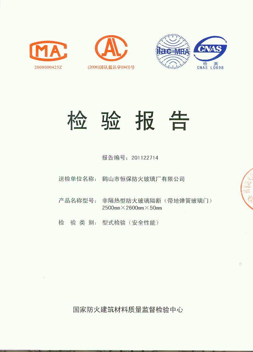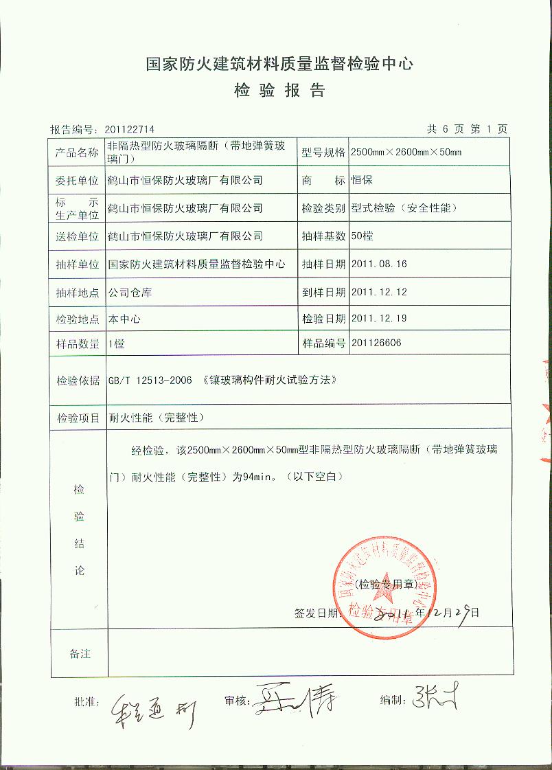 经检验,该2500mm×2600mm×50mm型非隔热型防火玻璃隔断(带地弹簧玻璃门)耐火性能(完整性)为94min。(以下空白)
