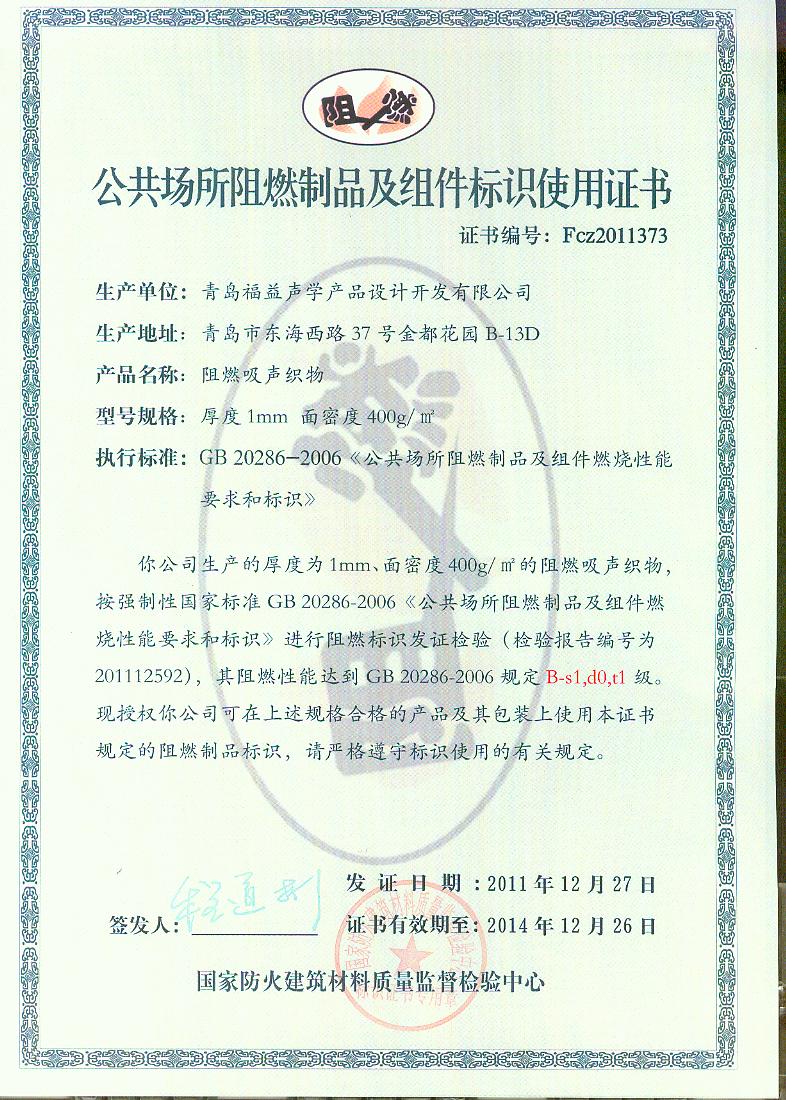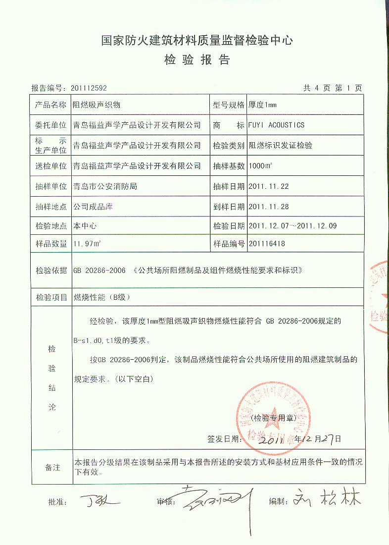 经检验,该厚度1mm型阻燃吸声织物燃烧性能符合 GB 20286-2006规定的B-s1,d0,t1级的要求。 按GB 20286-2006判定,该制品燃烧性能符合公共场所使用的阻燃建筑制品的规定要求。(以下空白)
