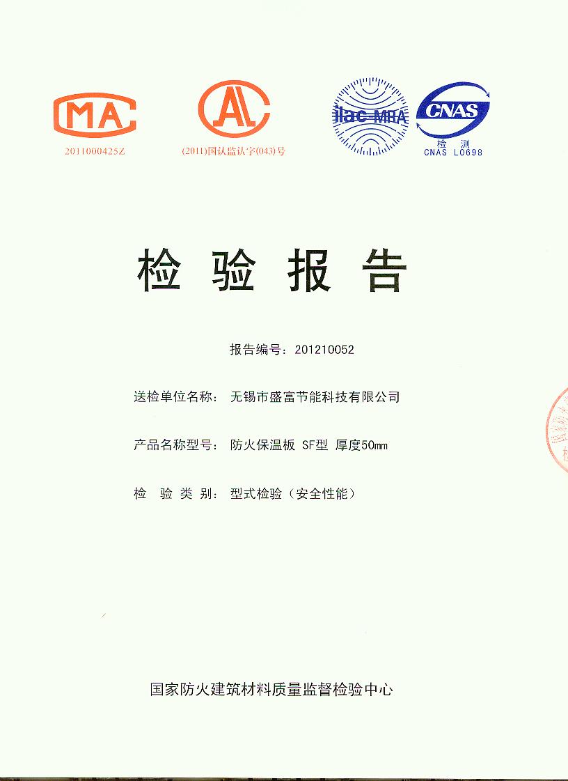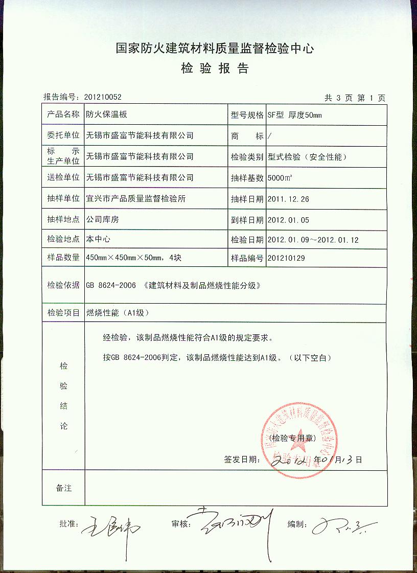 经检验,该制品燃烧性能符合A1级的规定要求。 按GB 8624-2006判定,该制品燃烧性能达到A1级。(以下空白)