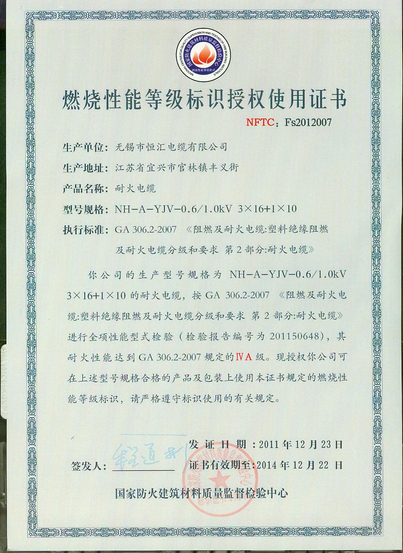 经检验,该NH-A-YJV-0.6/1.0kV 3×16+1×10耐火电缆耐火性能符合ⅣA级规定要求,其它各项技术指标均合格。 按GA 306.2-2007综合判定,该产品质量合格。(以下空白)