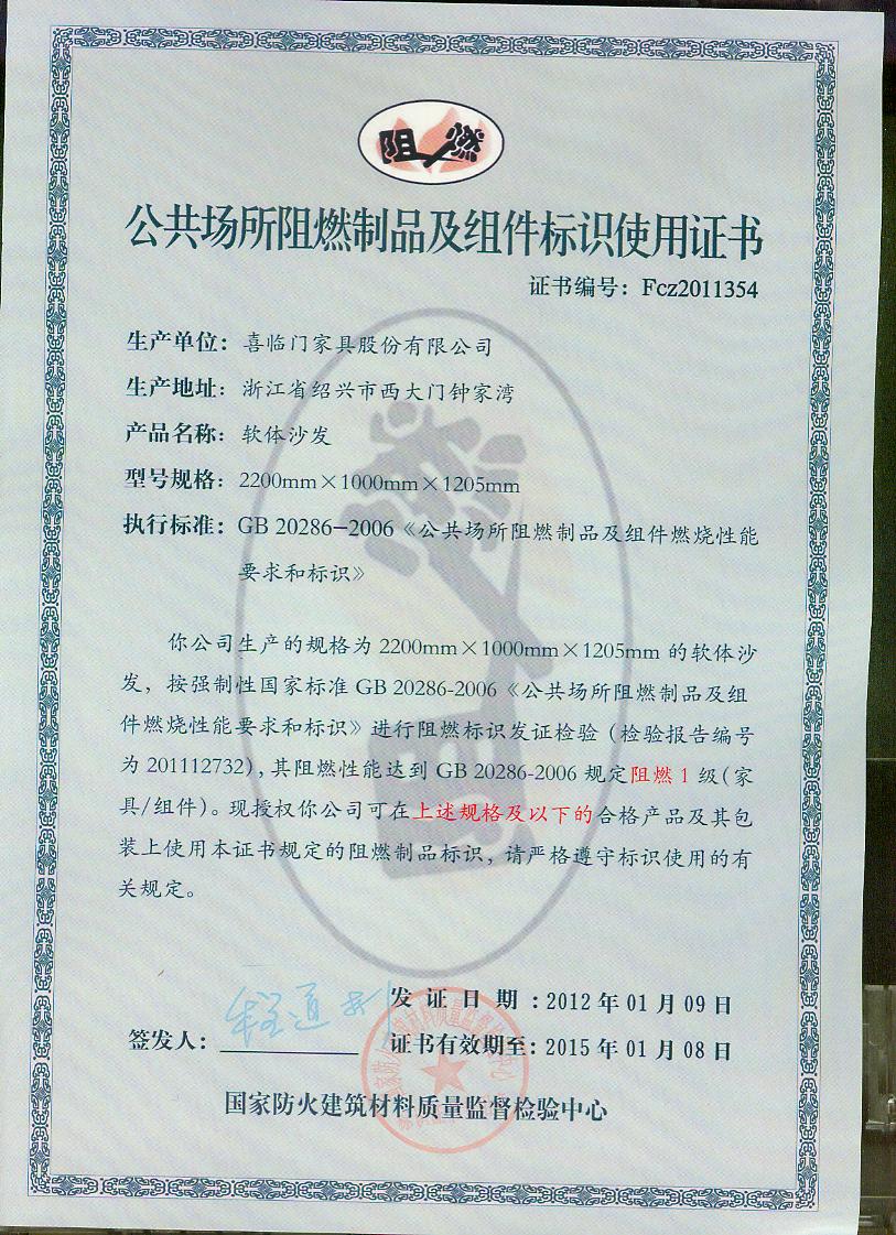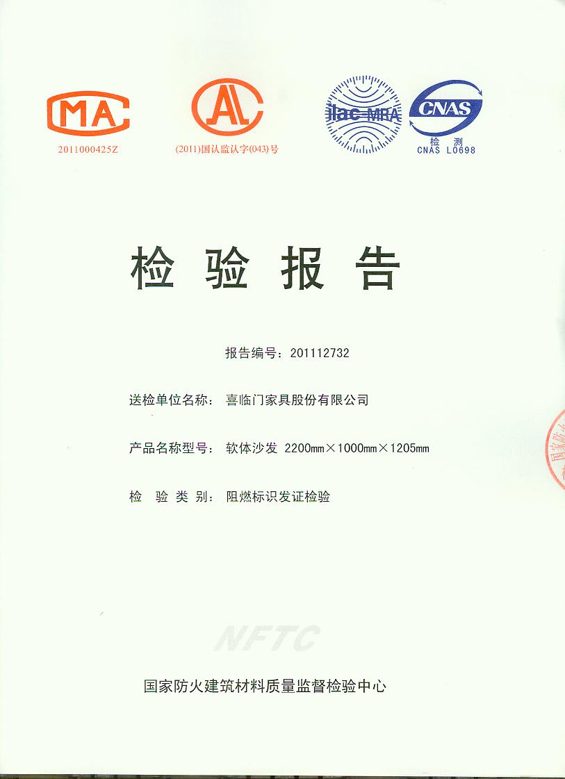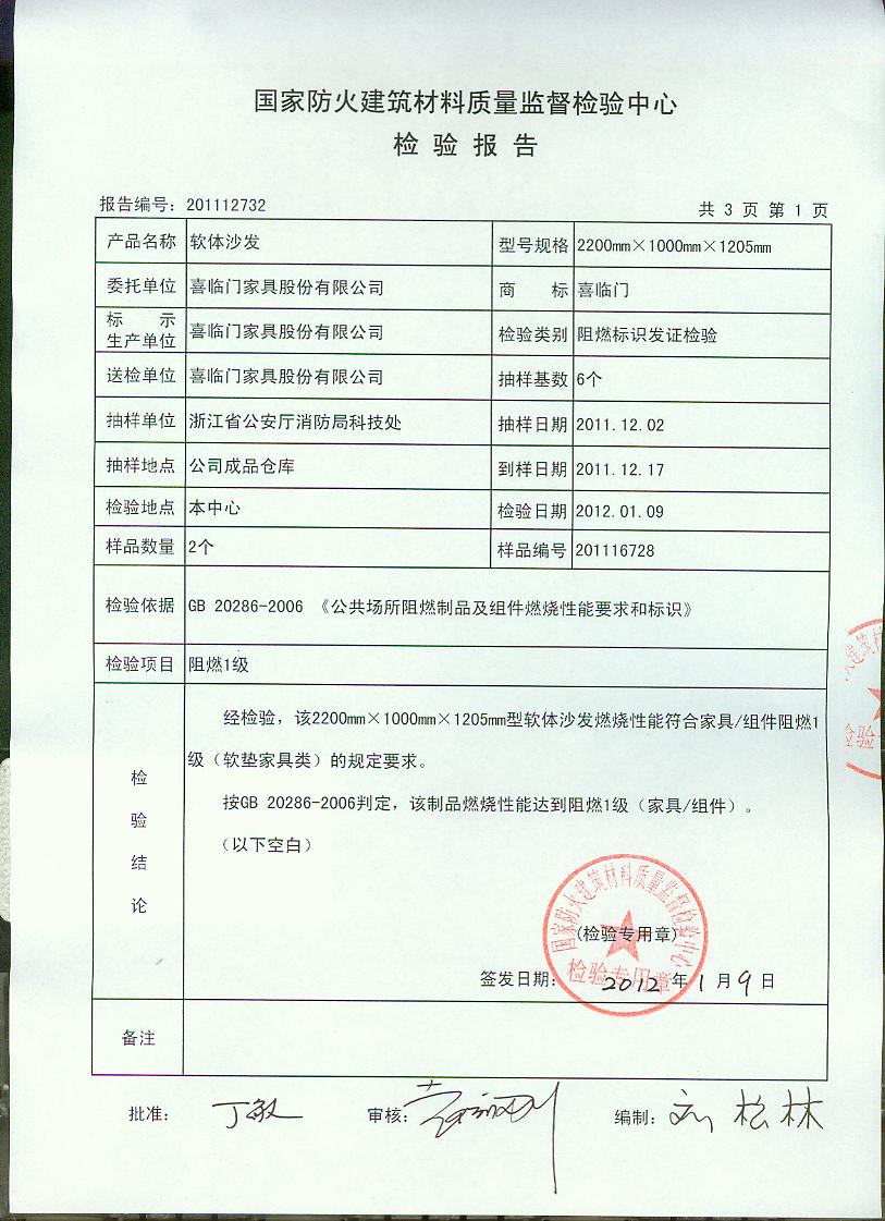 经检验,该2200mm×1000mm×1205mm型软体沙发燃烧性能符合家具/组件阻燃1级(软垫家具类)的规定要求。 按GB 20286-2006判定,该制品燃烧性能达到阻燃1级(家具/组件)。 (以下空白)