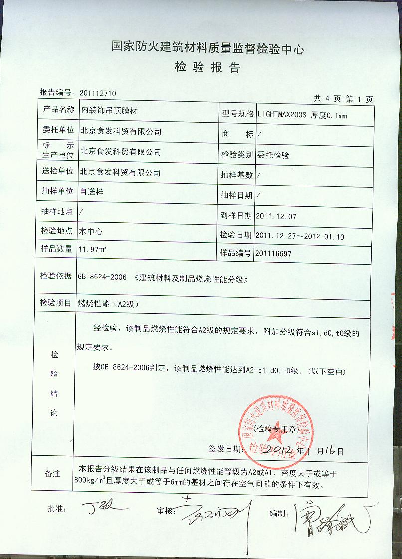 经检验,该制品燃烧性能符合A2级的规定要求,附加分级符合s1,d0,t0级的 规定要求。 按GB 8624-2006判定,该制品燃烧性能达到A2-s1,d0,t0级。(以下空白)