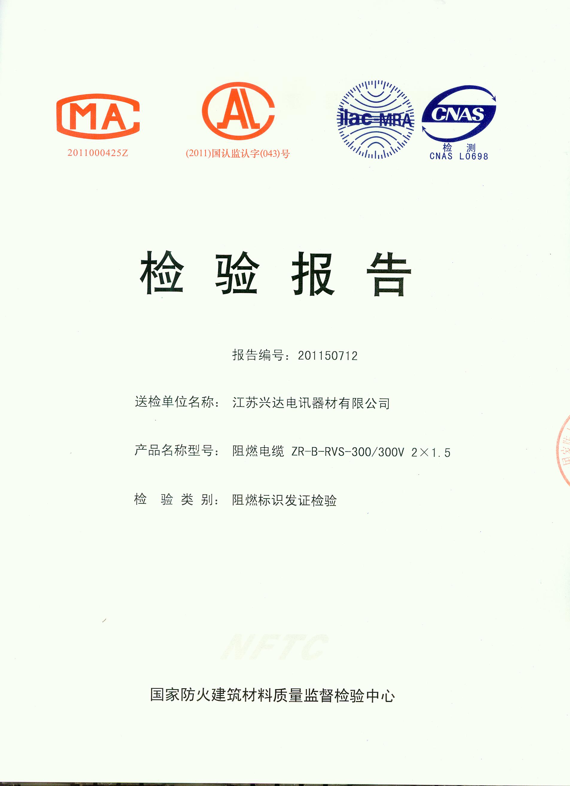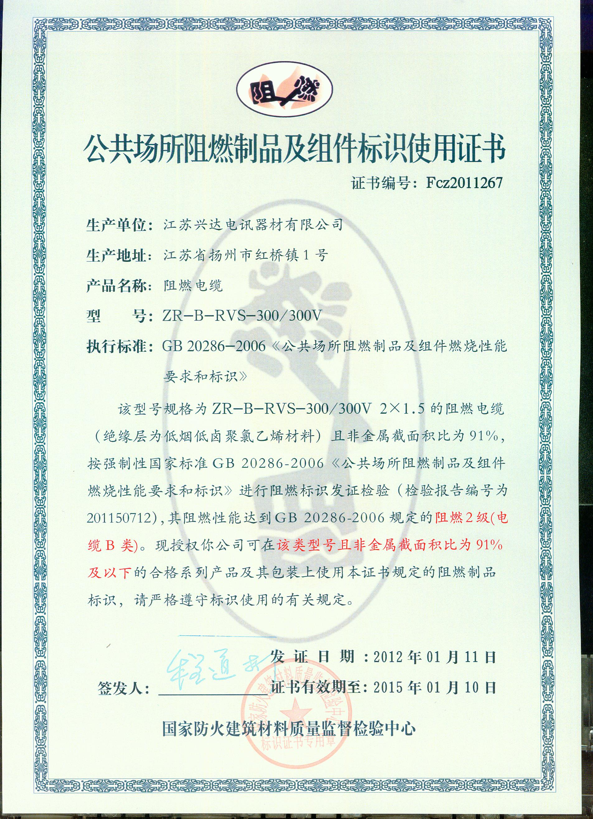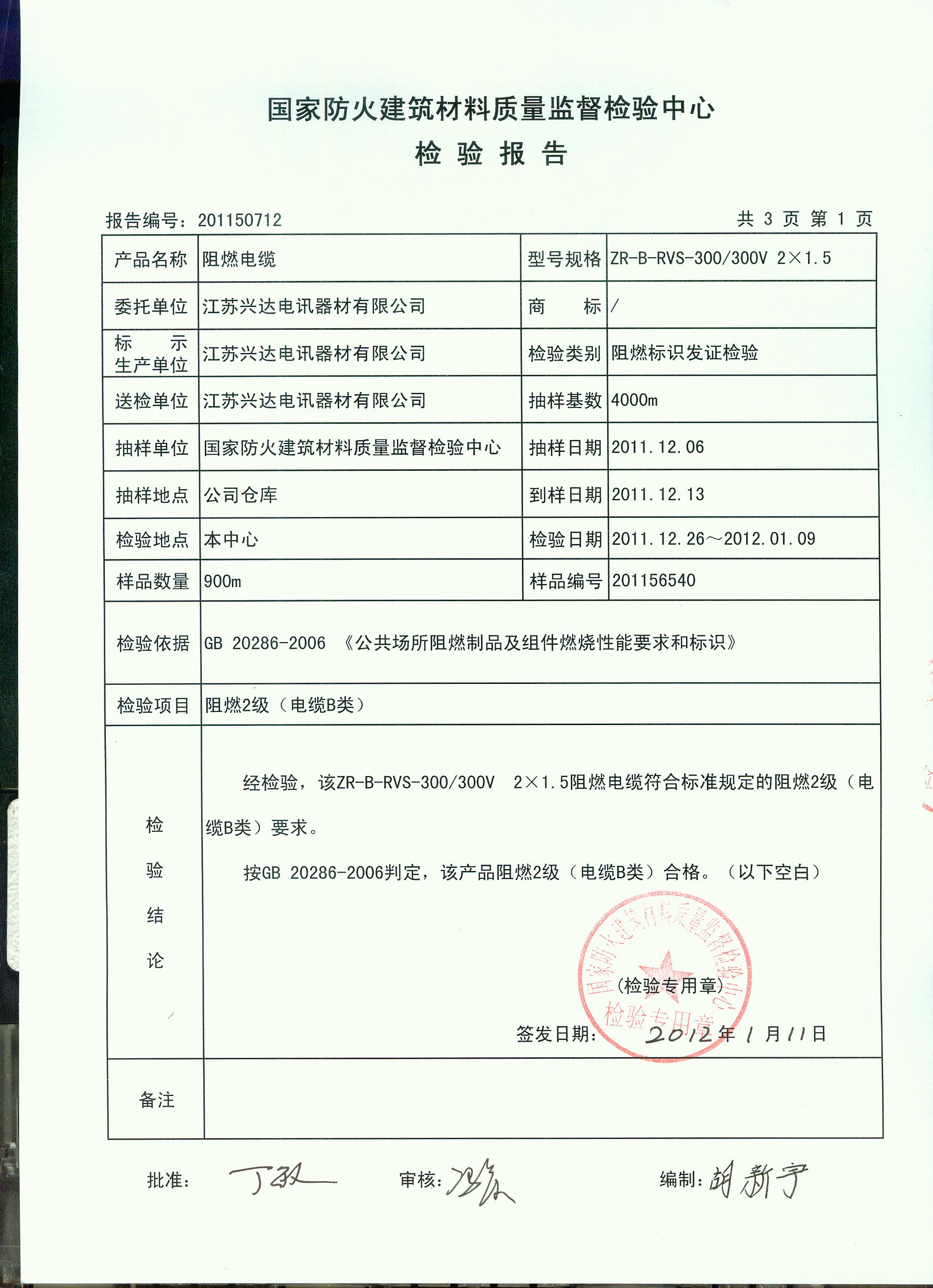 经检验,该ZR-B-RVS-300/300V 2×1.5阻燃电缆符合标准规定的阻燃2级(电缆B类)要求。 按GB 20286-2006判定,该产品阻燃2级(电缆B类)合格。(以下空白)