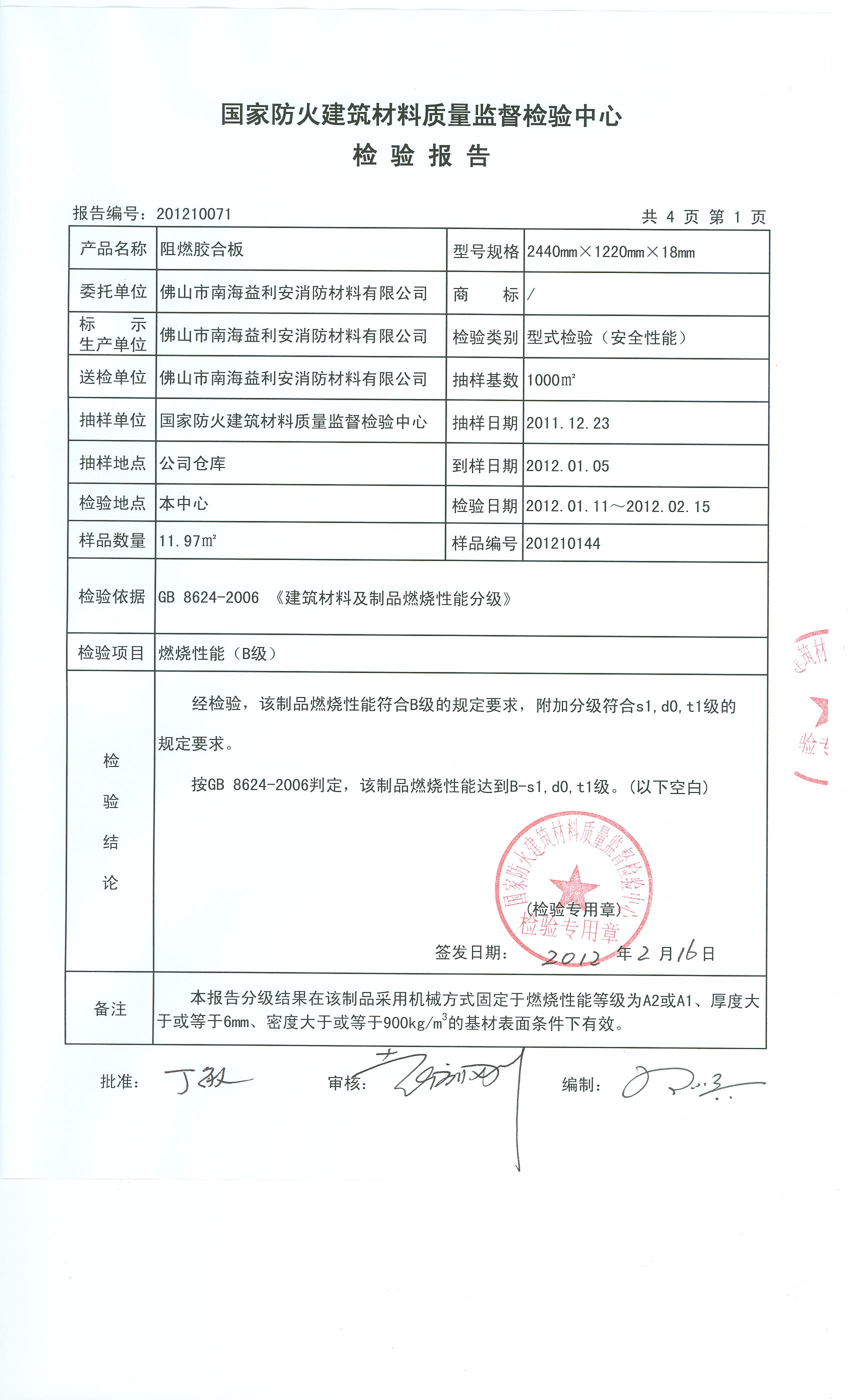 经检验,该制品燃烧性能符合B级的规定要求,附加分级符合s1,d0,t1级的 规定要求。 按GB 8624-2006判定,该制品燃烧性能达到B-s1,d0,t1级。(以下空白)
