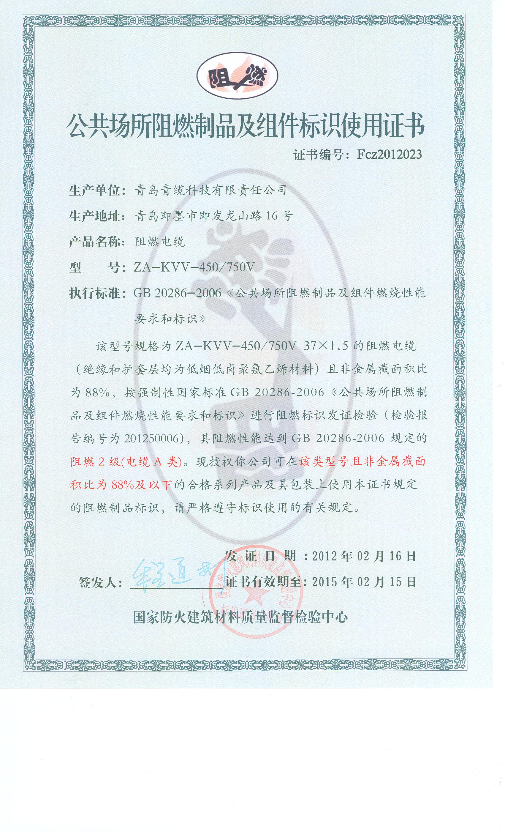 经检验,该ZA-KVV-450/750V 37×1.5阻燃电缆符合标准规定的阻燃2级(电缆A类) 要求。 按GB 20286-2006判定,该产品阻燃2级(电缆A类)合格。(以下空白)