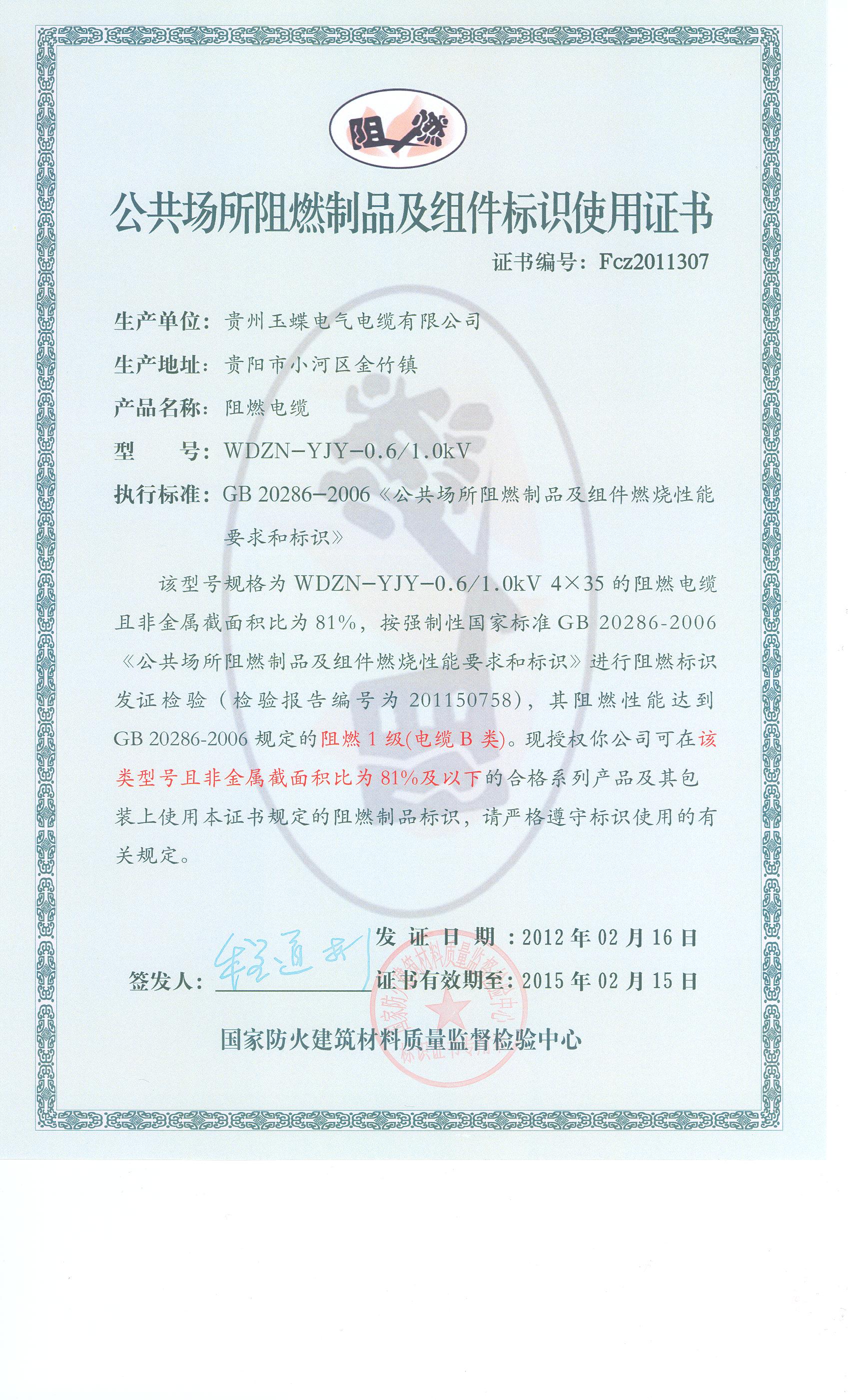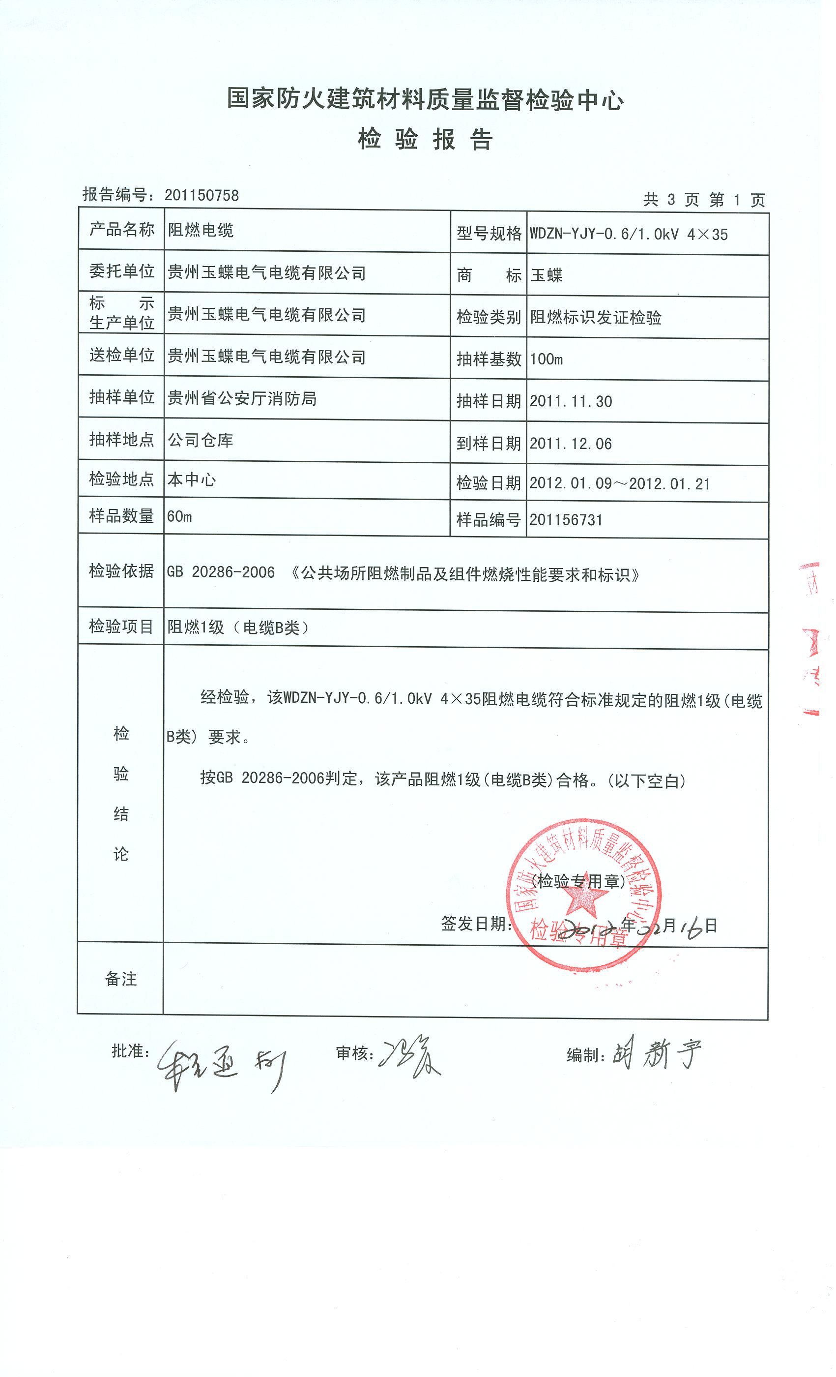 经检验,该WDZN-YJY-0.6/1.0kV 4×35阻燃电缆符合标准规定的阻燃1级(电缆B类) 要求。 按GB 20286-2006判定,该产品阻燃1级(电缆B类)合格。(以下空白)