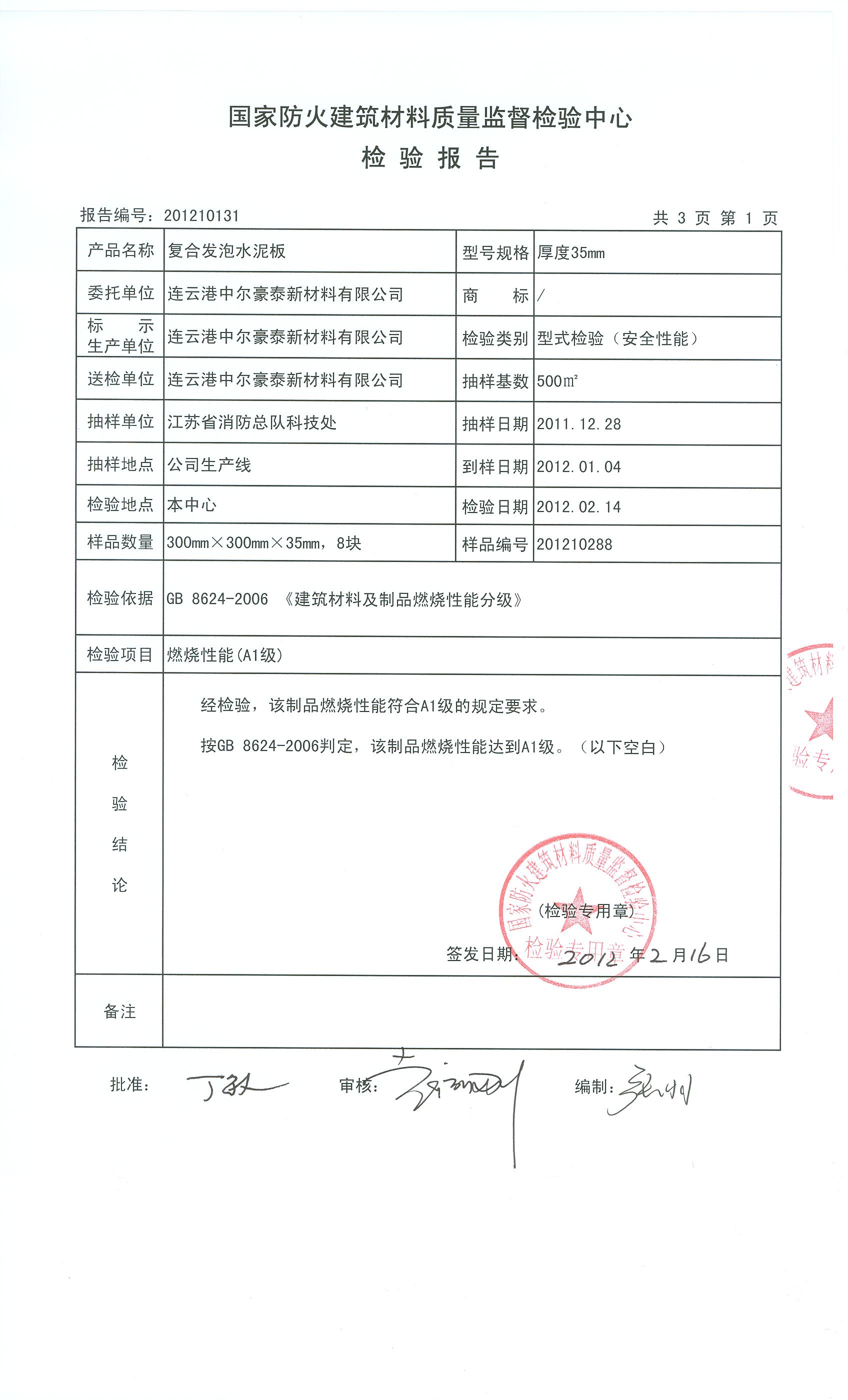 经检验,该制品燃烧性能符合A1级的规定要求。 按GB 8624-2006判定,该制品燃烧性能达到A1级。(以下空白)