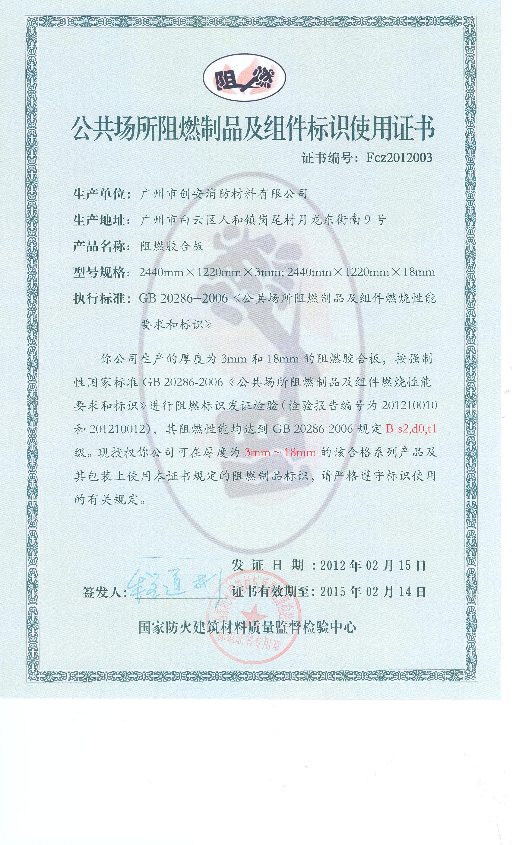 经检验,该2440mm×1220mm×18mm型的阻燃胶合板燃烧性能符合GB 20286-2006规定的B-s1,d0,t1级要求。 按GB 20286-2006判定,该制品燃烧性能符合公共场所使用的阻燃建筑制品的规定要求。(以下空白)