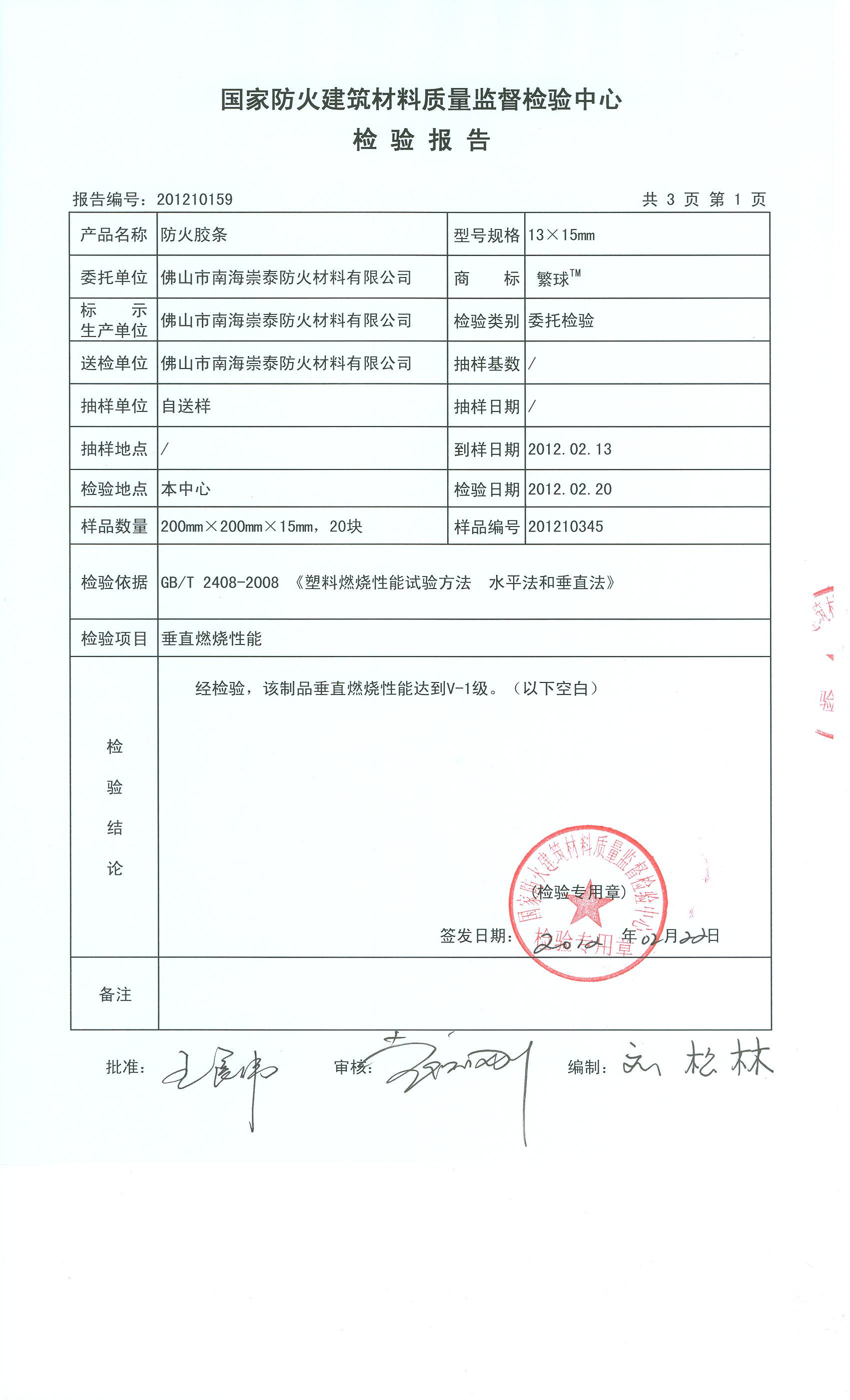 经检验,该制品垂直燃烧性能达到V-1级。(以下空白)