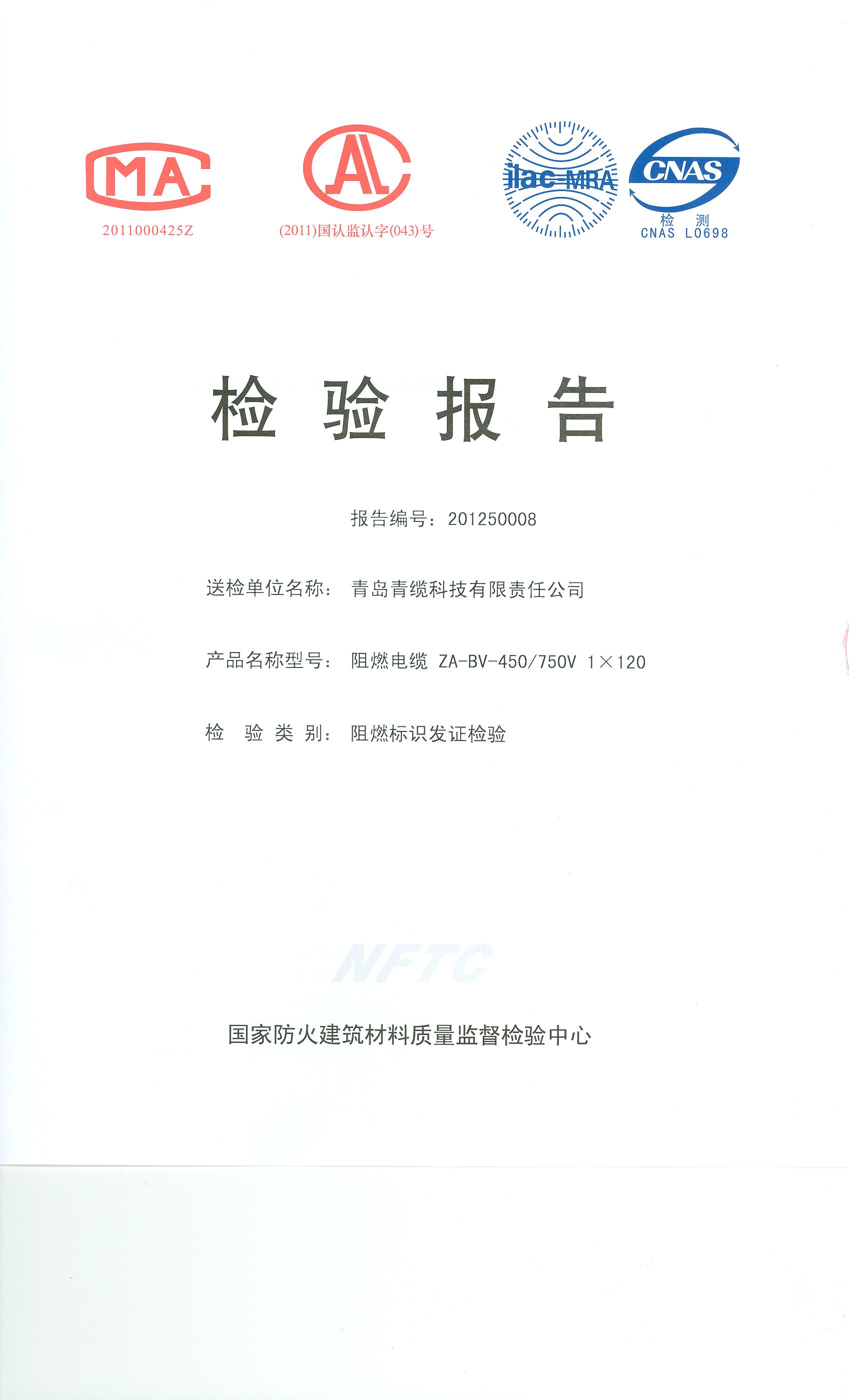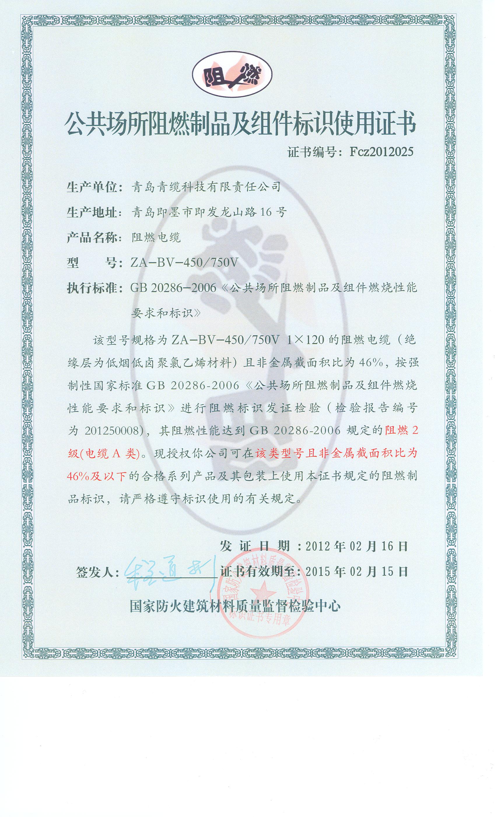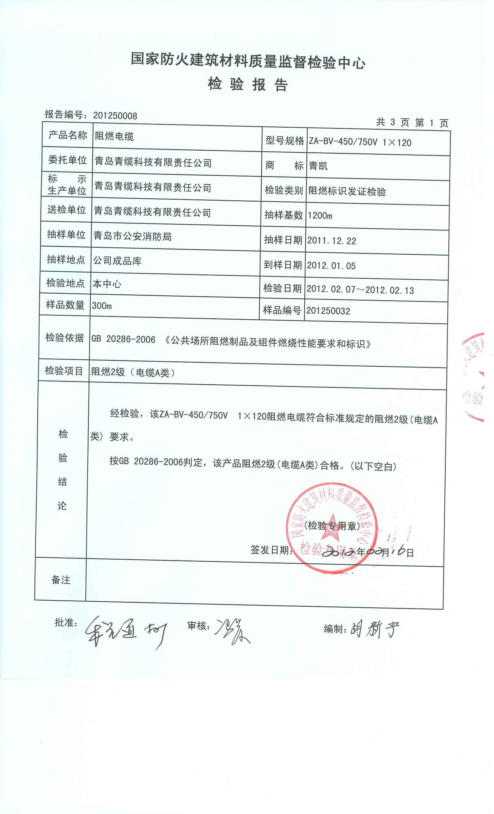 经检验,该ZA-BV-450/750V 1×120阻燃电缆符合标准规定的阻燃2级(电缆A类) 要求。 按GB 20286-2006判定,该产品阻燃2级(电缆A类)合格。(以下空白)