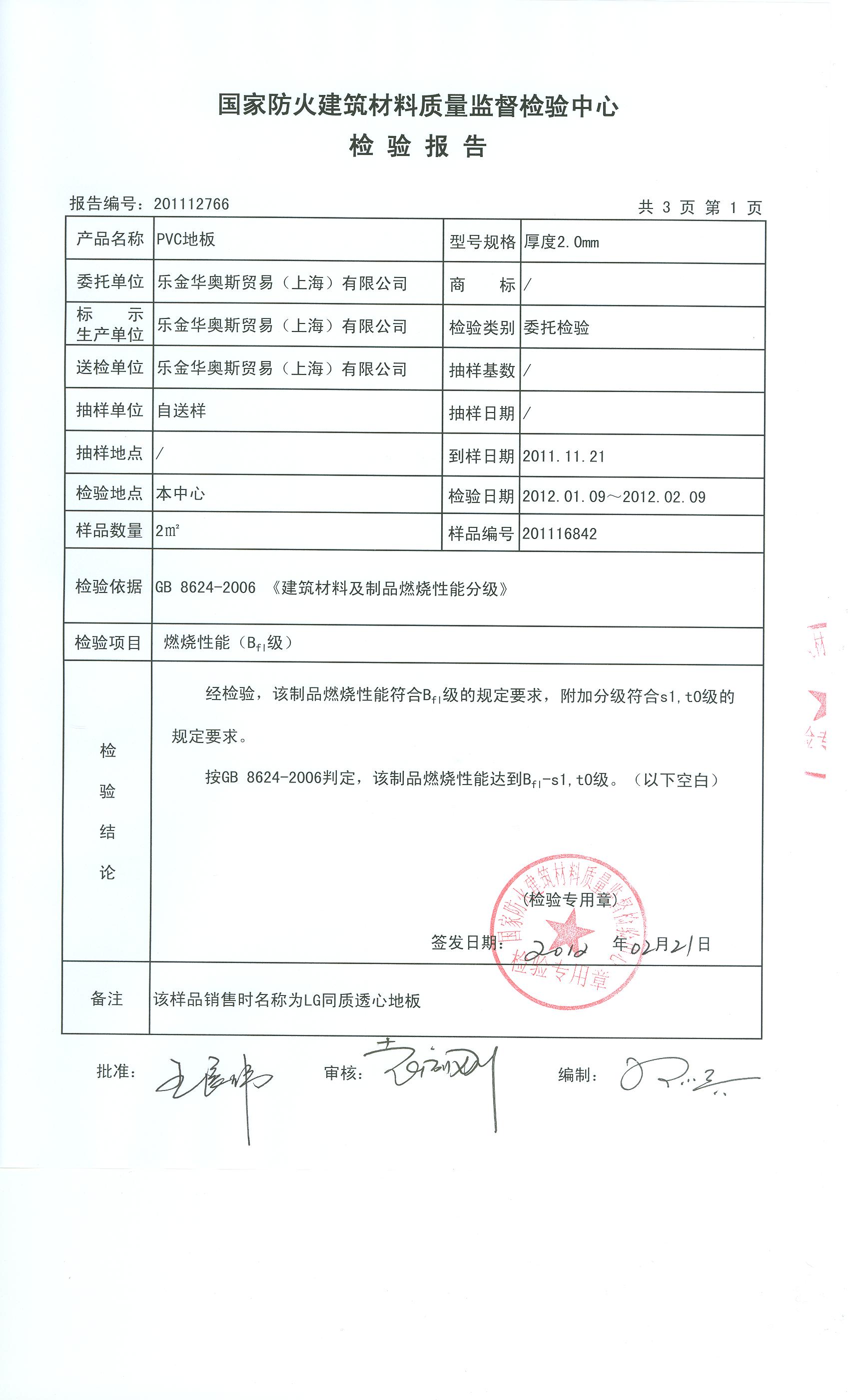 经检验,该制品燃烧性能符合B_(fl)级的规定要求,附加分级符合s1,t0级的 规定要求。 按GB 8624-2006判定,该制品燃烧性能达到B_(fl)-s1,t0级。(以下空白)
