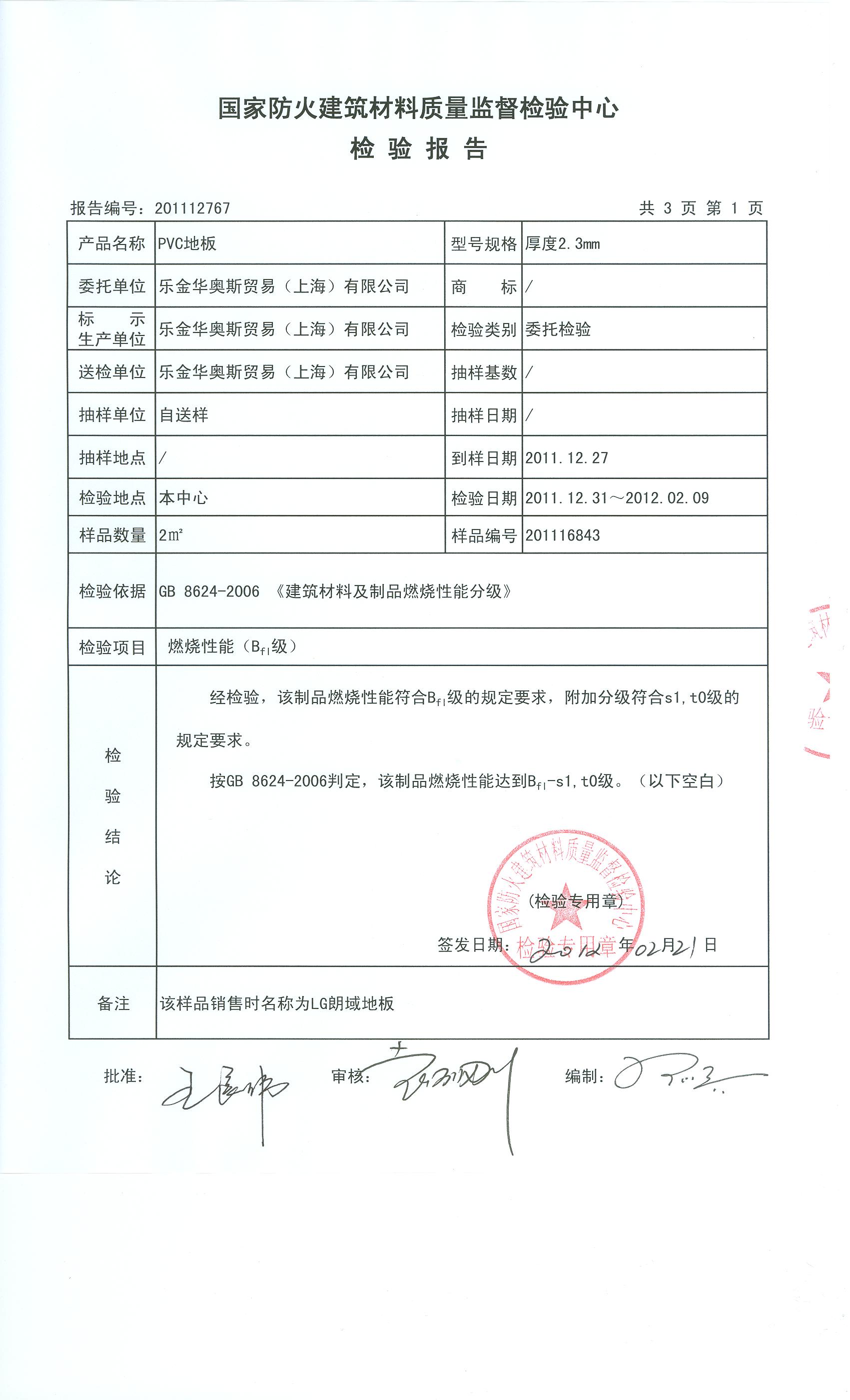 经检验,该制品燃烧性能符合B_(fl)级的规定要求,附加分级符合s1,t0级的 规定要求。 按GB 8624-2006判定,该制品燃烧性能达到B_(fl)-s1,t0级。(以下空白)