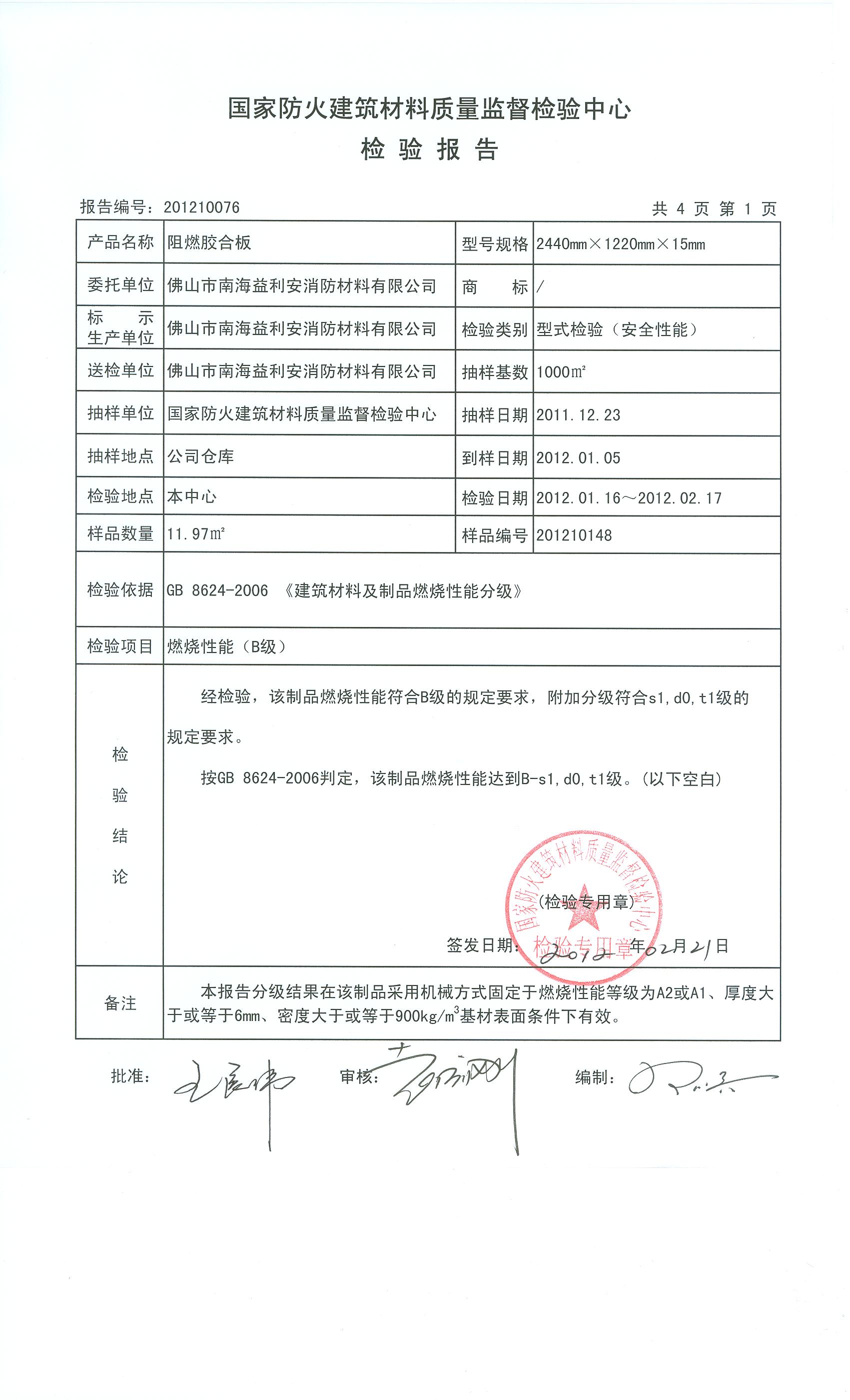 经检验,该制品燃烧性能符合B级的规定要求,附加分级符合s1,d0,t1级的 规定要求。 按GB 8624-2006判定,该制品燃烧性能达到B-s1,d0,t1级。(以下空白)