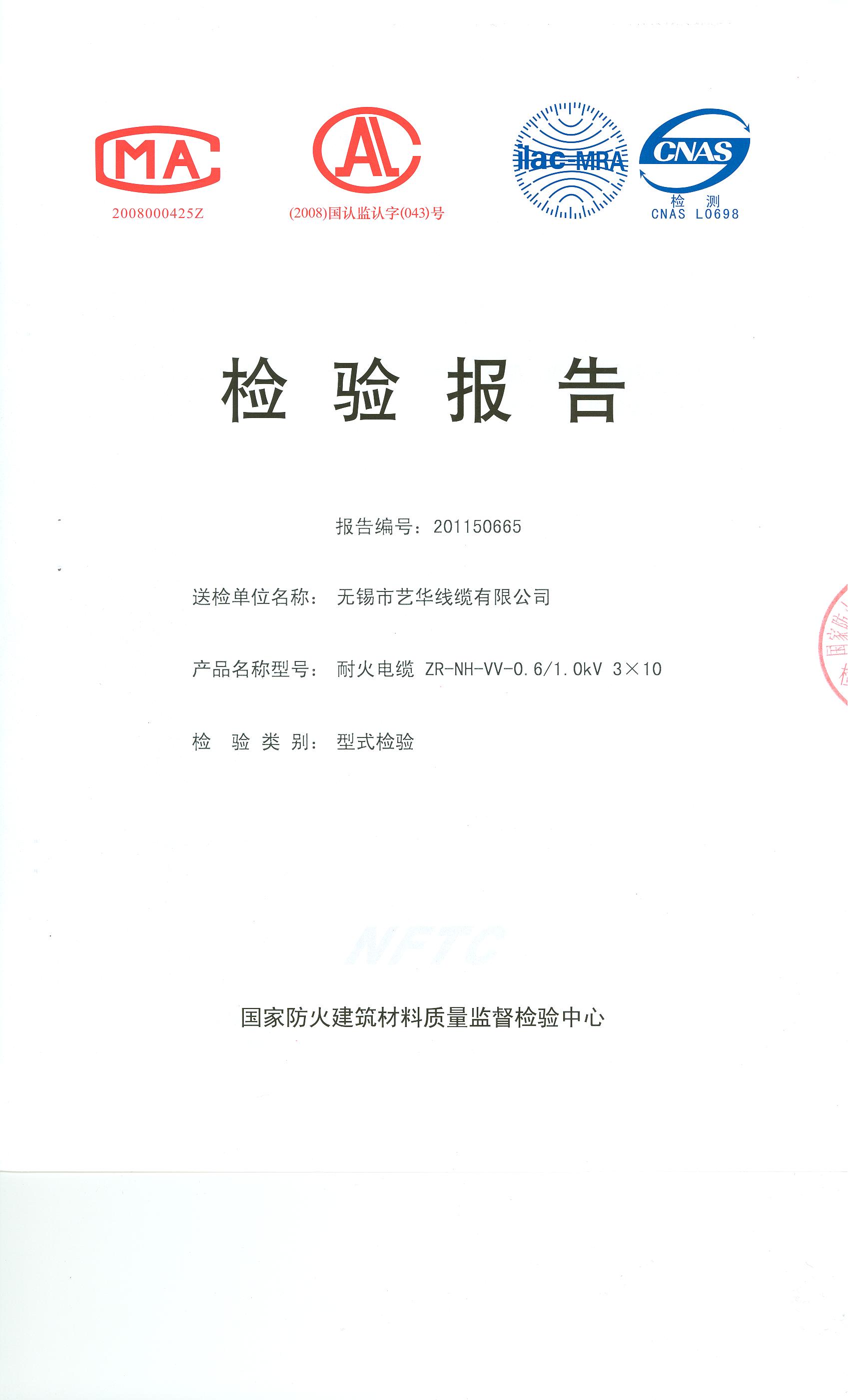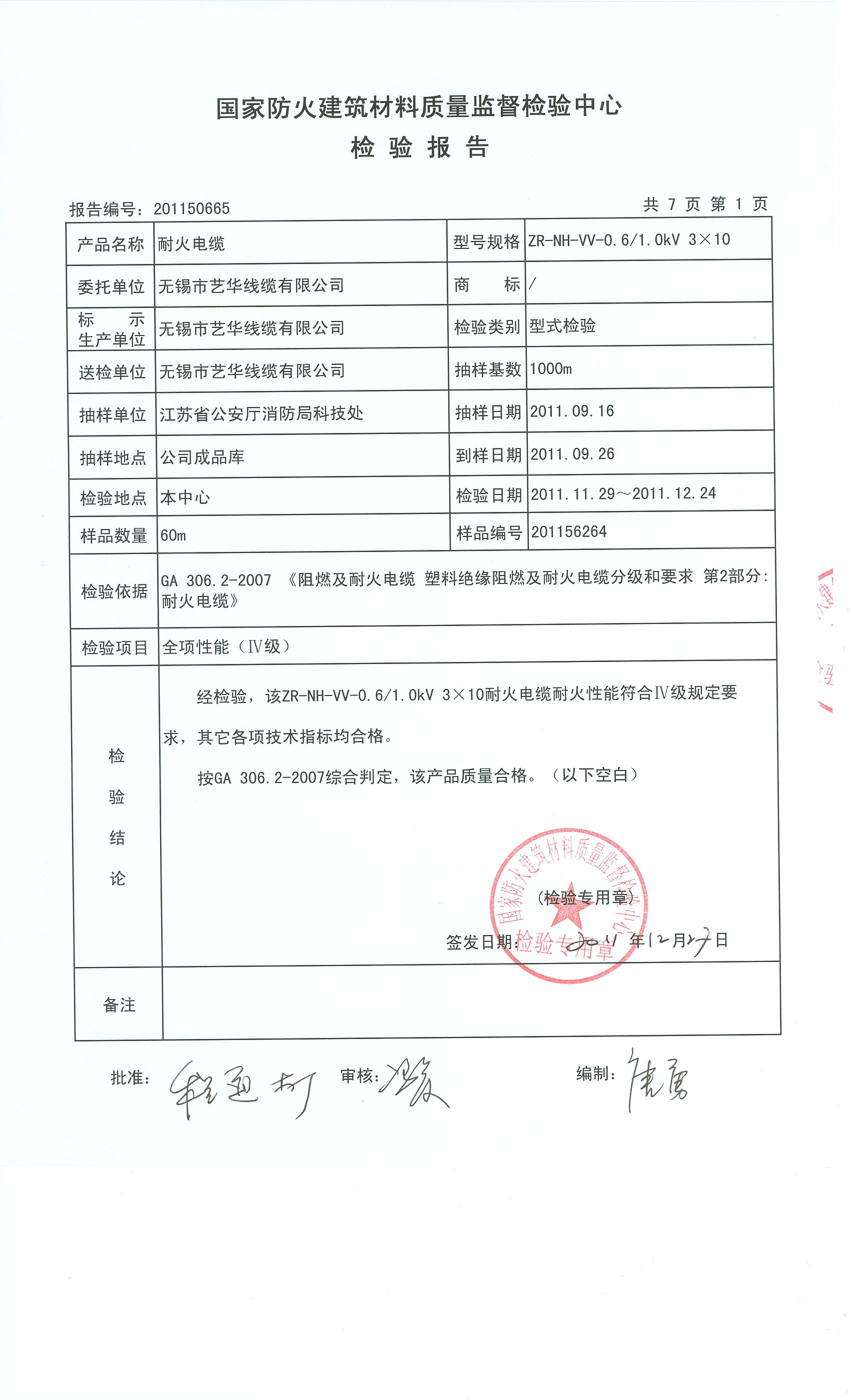 经检验,该ZR-NH-VV-0.6/1.0kV 3×10耐火电缆耐火性能符合Ⅳ级规定要求,其它各项技术指标均合格。 按GA 306.2-2007综合判定,该产品质量合格。(以下空白)