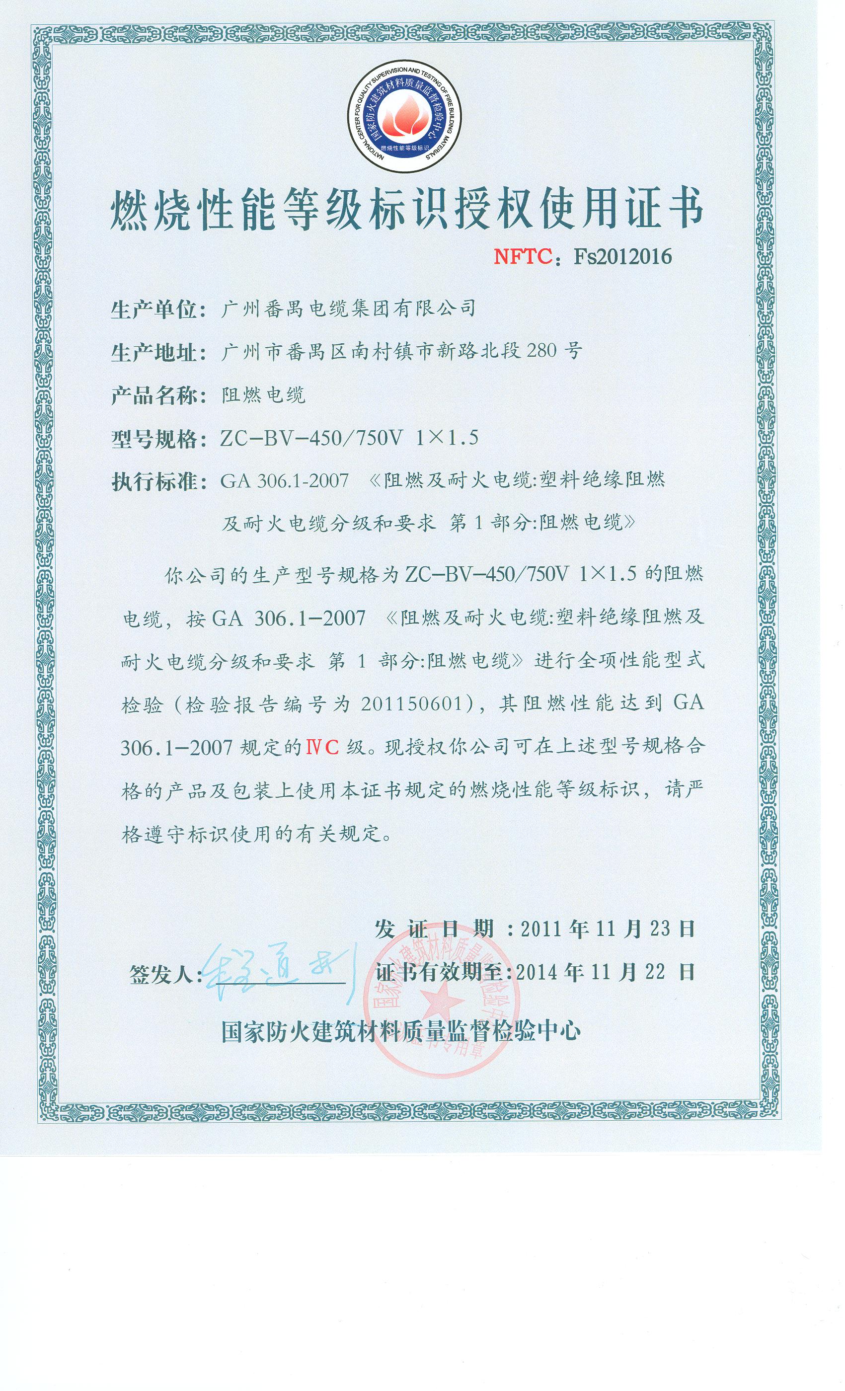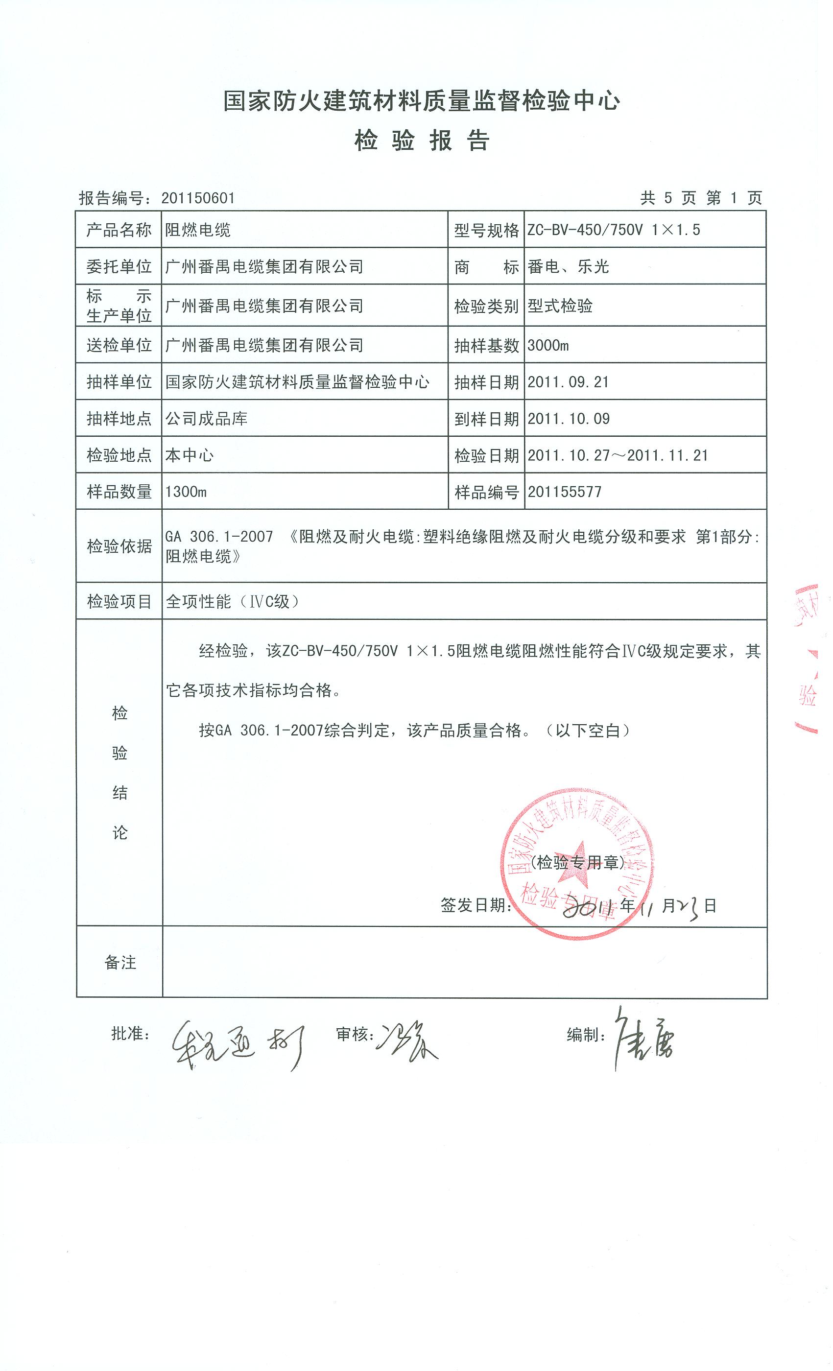 经检验,该ZC-BV-450/750V 1×1.5阻燃电缆阻燃性能符合ⅣC级规定要求,其它各项技术指标均合格。 按GA 306.1-2007综合判定,该产品质量合格。(以下空白)