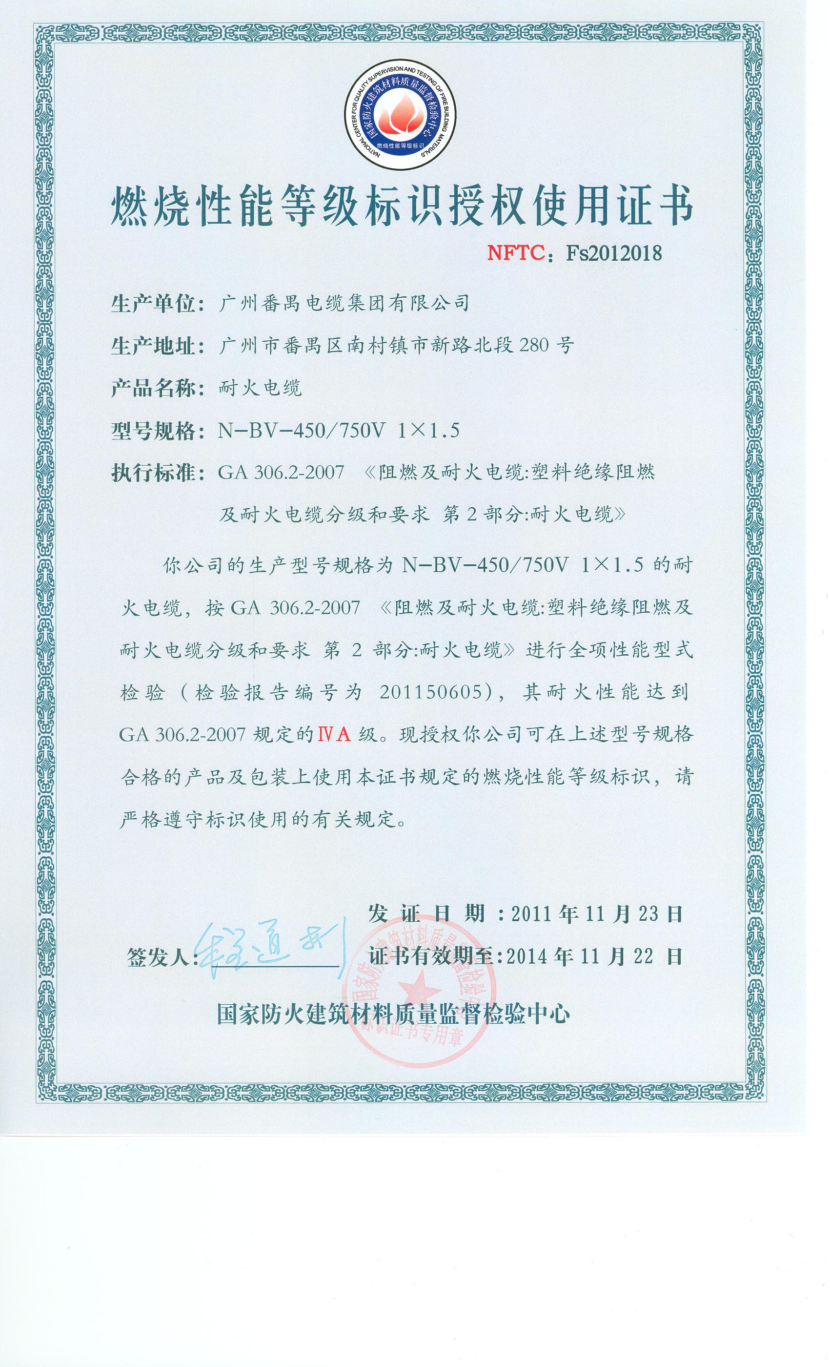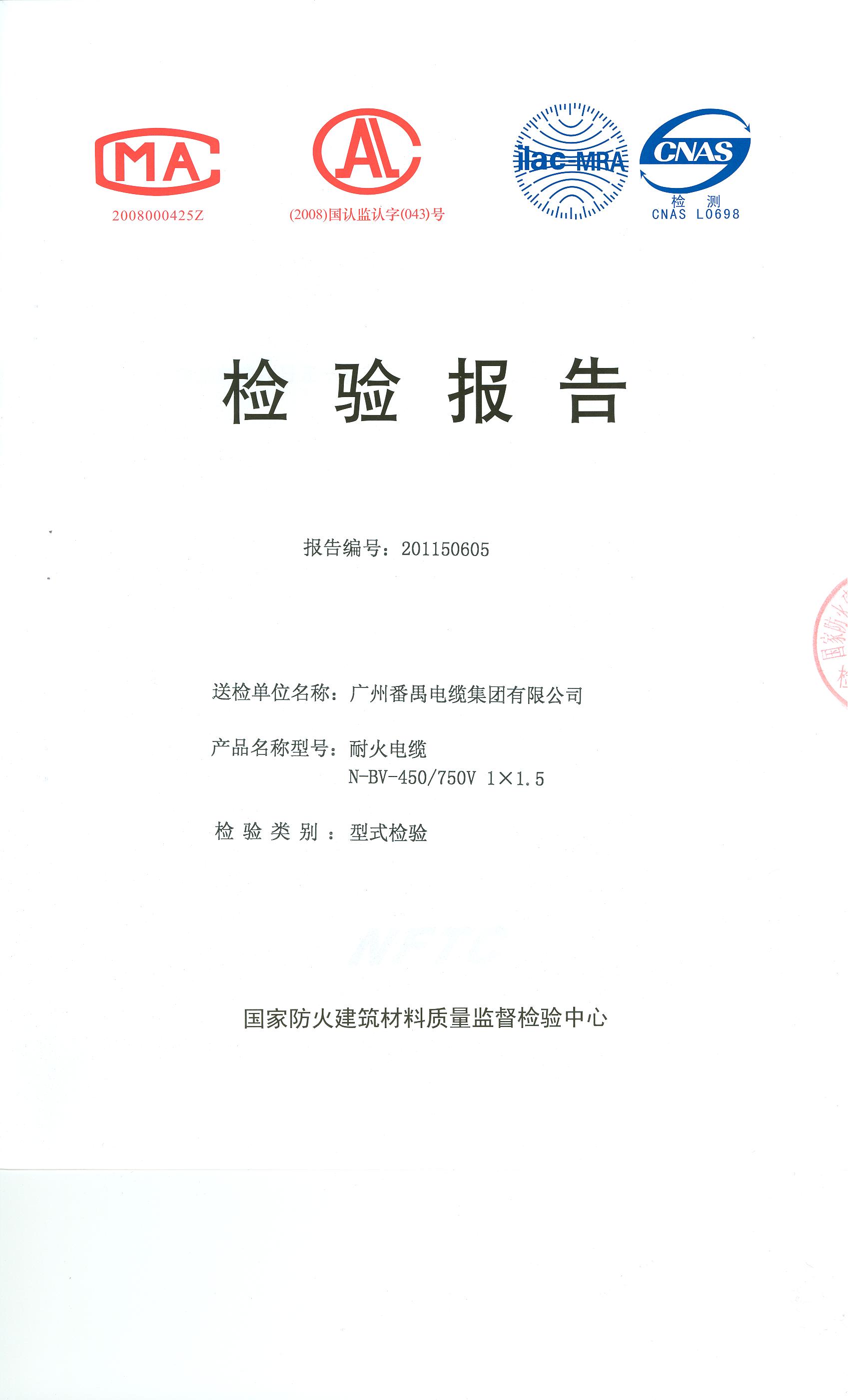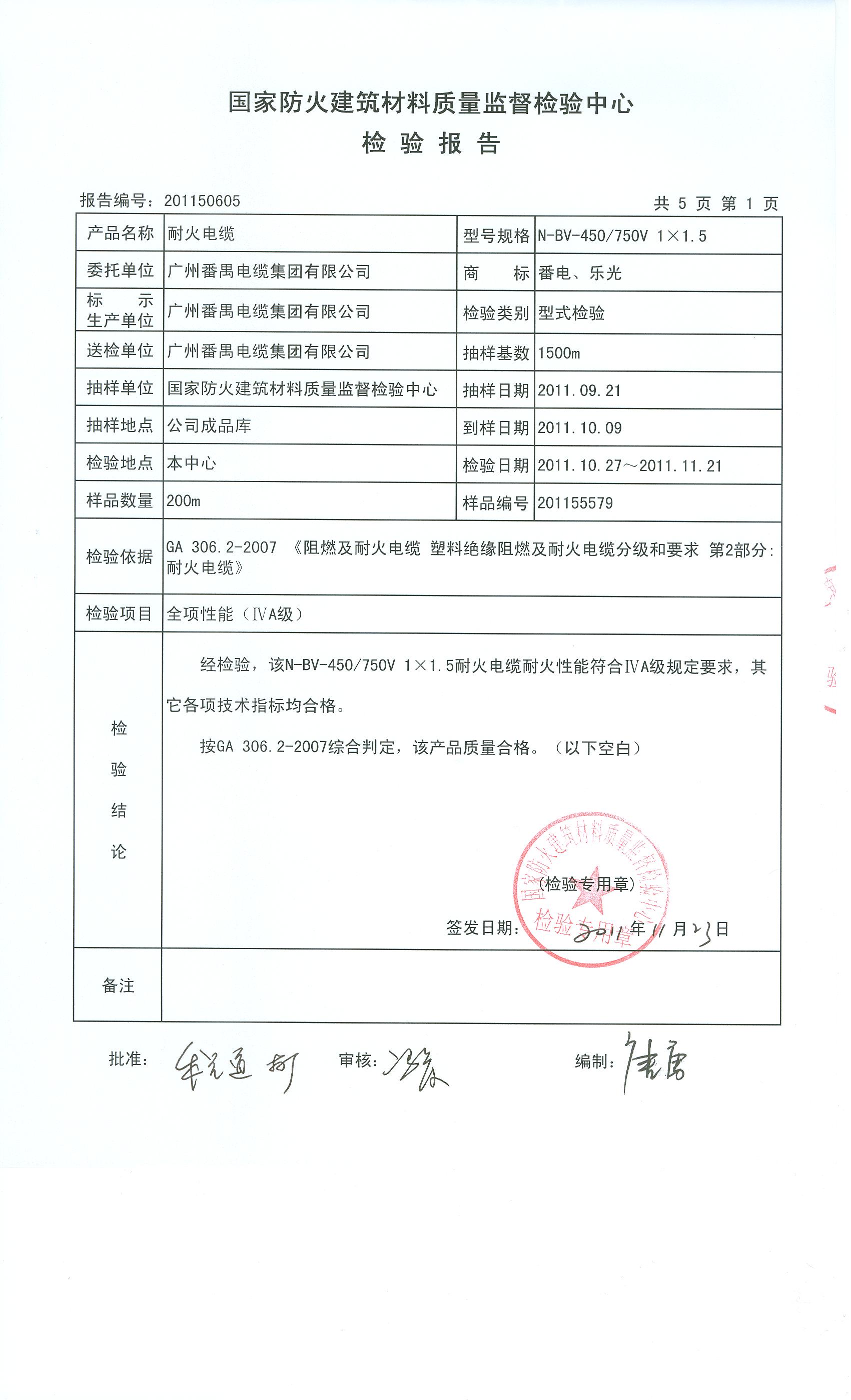 经检验,该N-BV-450/750V 1×1.5耐火电缆耐火性能符合ⅣA级规定要求,其它各项技术指标均合格。 按GA 306.2-2007综合判定,该产品质量合格。(以下空白)